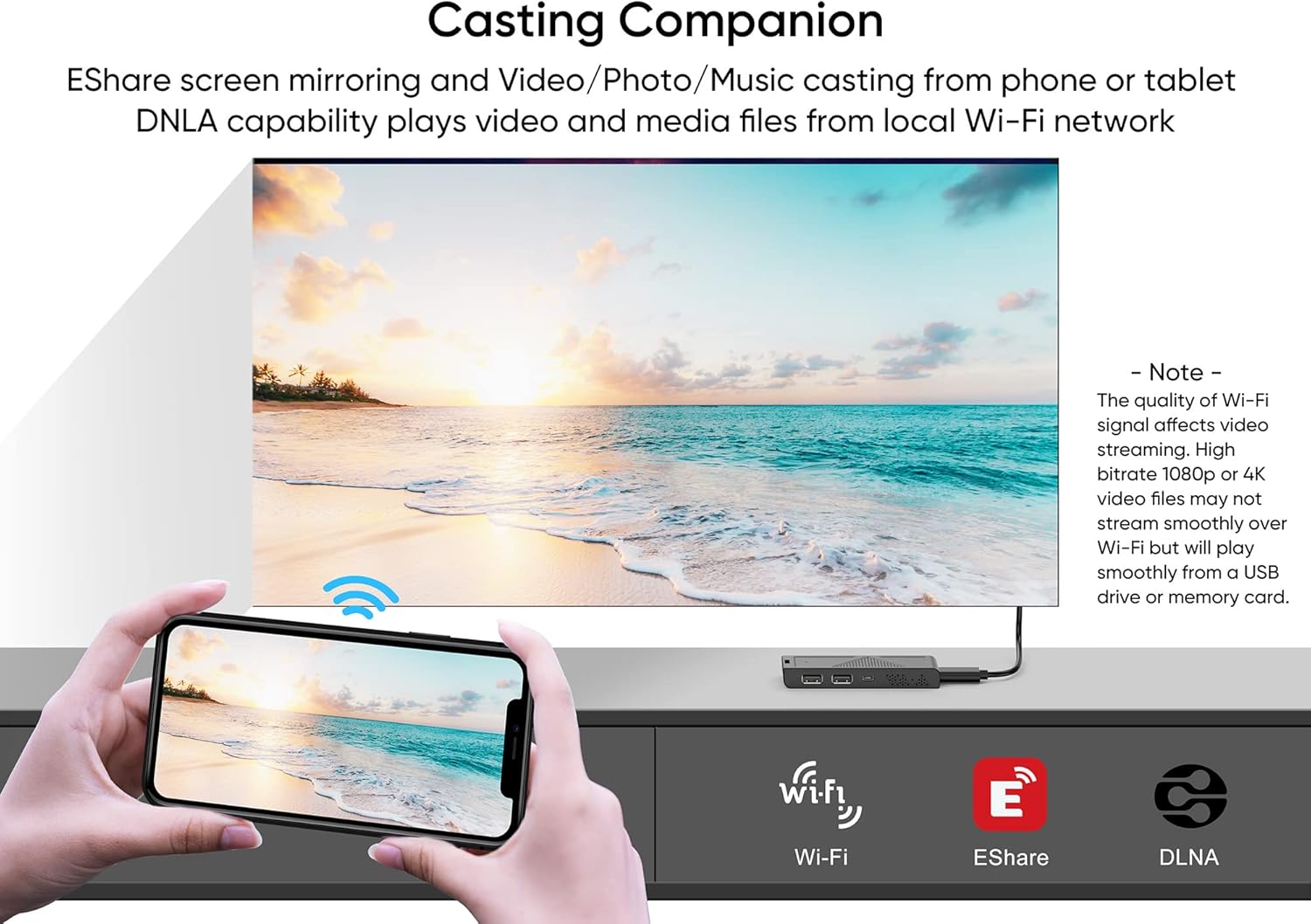 Wi-Fi CONNECTIVITY – Together with the EShare app on a smartphone or tablet, the ATOM Cast can perform bi-directional wireless screen mirroring, remote touch control, as well as video/photo/music casting. It is also compatible with DLNA/UPnP for streaming media files from local servers.