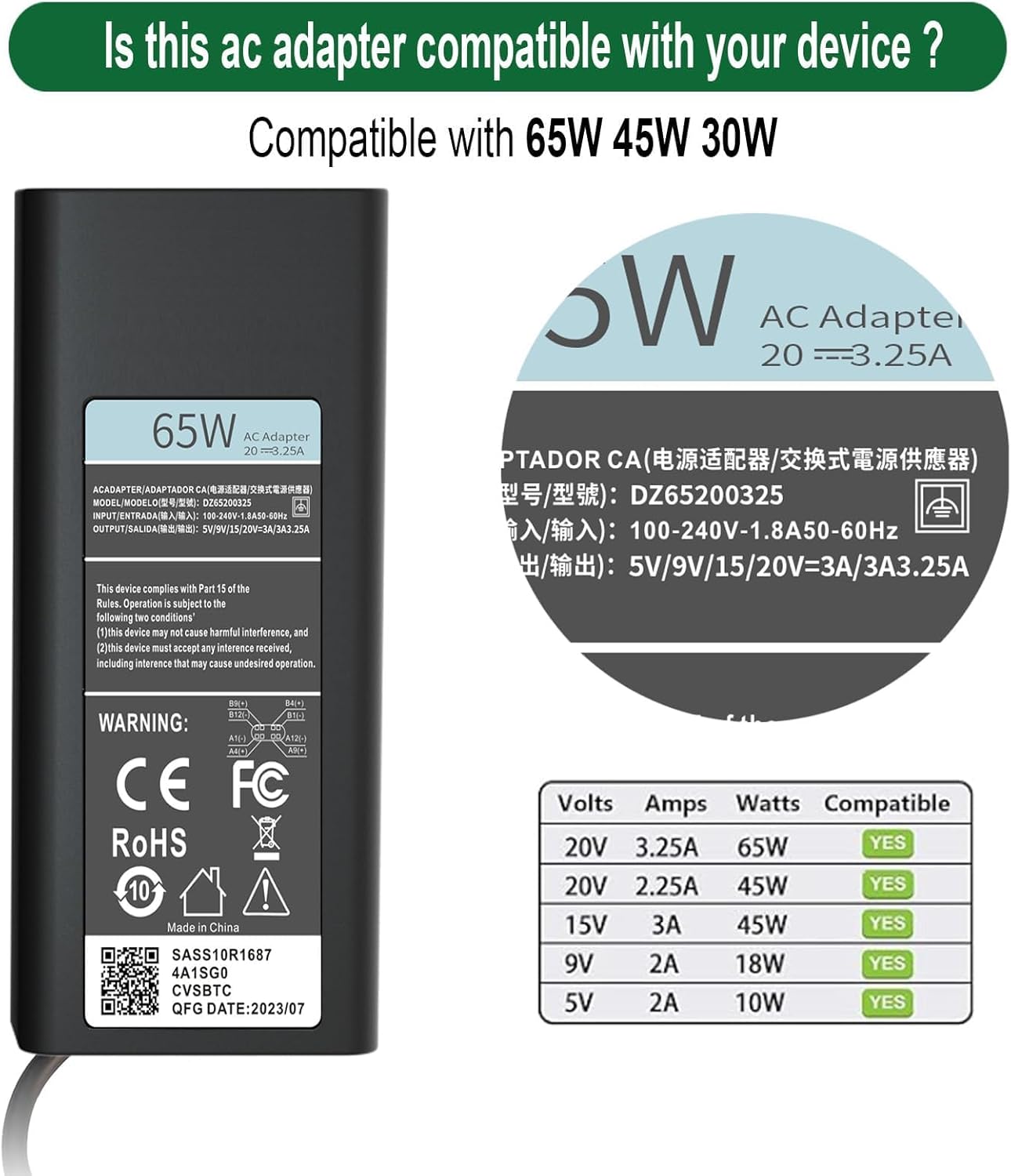 【Slim Dell 65W USB-C Laptop Charger Specs】: Output Max – 65W 20V/3.25A, 20 V/3 A, 20V/2.25, Input: 100V-240V, 50-60Hz. Watt: 65W (Compatible with 60W 45W), Connector: USB C Type C. Cable Length: 10ft.