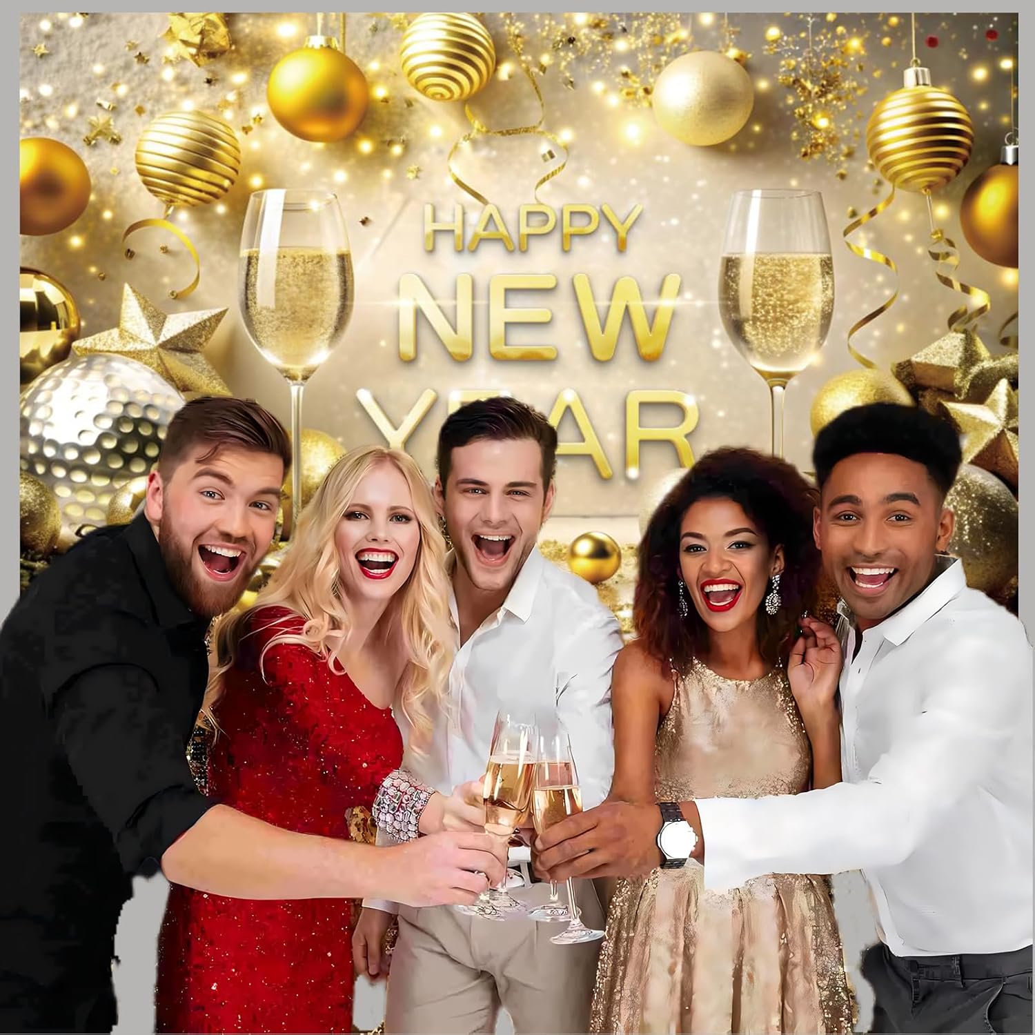 [Notely Designed] – Large size happy new year backdrop, printed with glitter gold ‘HAPPY NEW YEAR’, golden ball ornaments signs, lights, cheers up, champagne, etc. It is a good party addition decor item to celebrate and cheer for the coming 2025, creating a wonderful New Year Eve party.