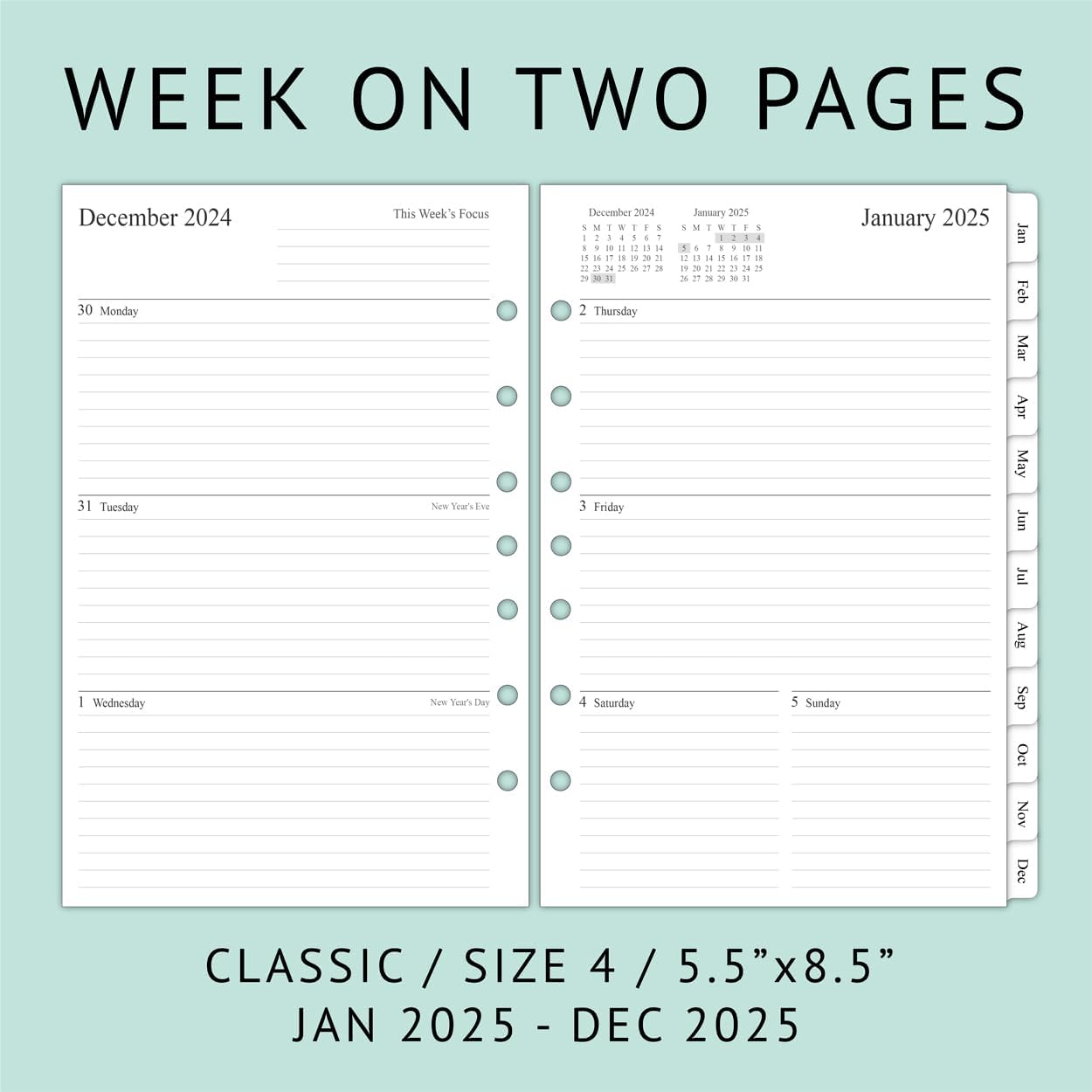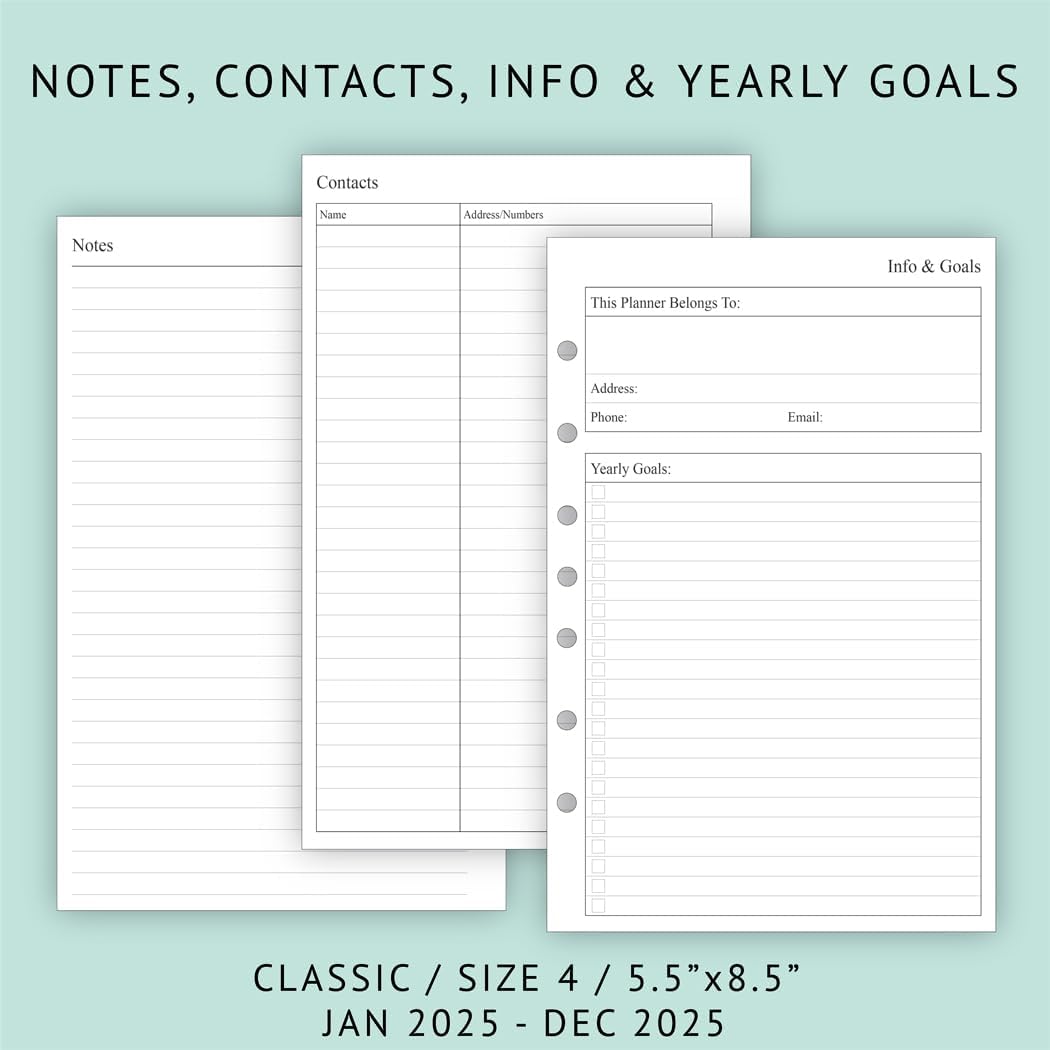 Refill your 3 ring or 7 ring mini binders (5.5″x8.5″) and keep organized with this 2025 weekly planner refills that feature coated monthly tabs, yearly goals, important dates, holidays and notes pages.