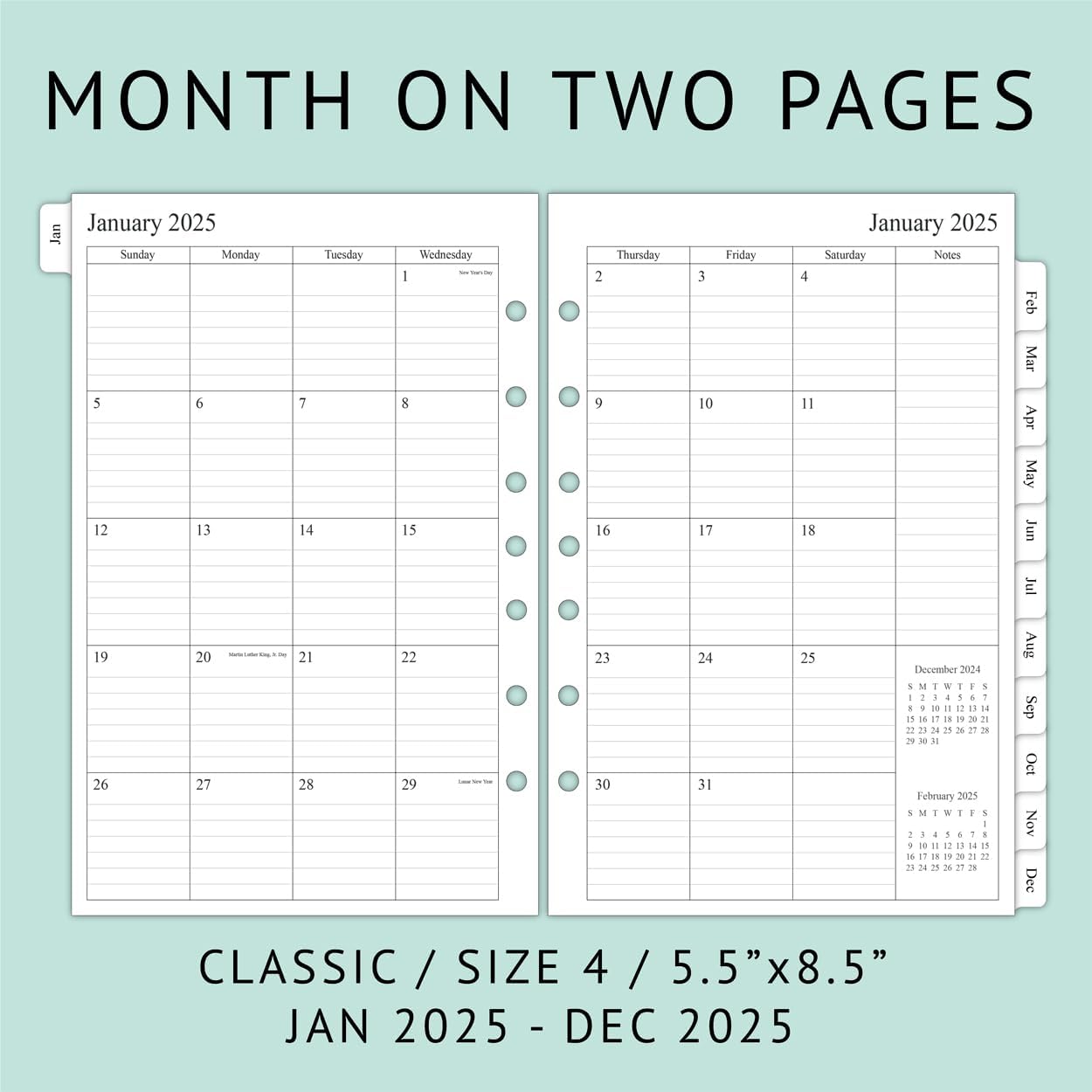 2025 planner refills 5.5″x8.5″ for 3-Ring or 7-ring mini binders (half letter size), Jan 2025 to Dec 2025