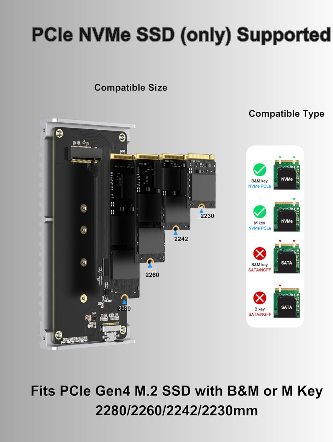 Wide Compatibility and upto 8TB Capacity: The 40Gbps M.2 Nvme SSD Enclosure is just Plug and play with no driver installation required. The SSD external enclosure is the preferred choice for gamers, video editors, photographers, and office workers. It supports M/B+M key NVMe solid-state drives with a maximum capacity of 8TB capacity in size of 2280/2260/2242/2230mm(Note: It does not support SATA NGFF solid-state drives or mSATA solid-state drives), fix Windows/Mac OS/Linux/Android systems.