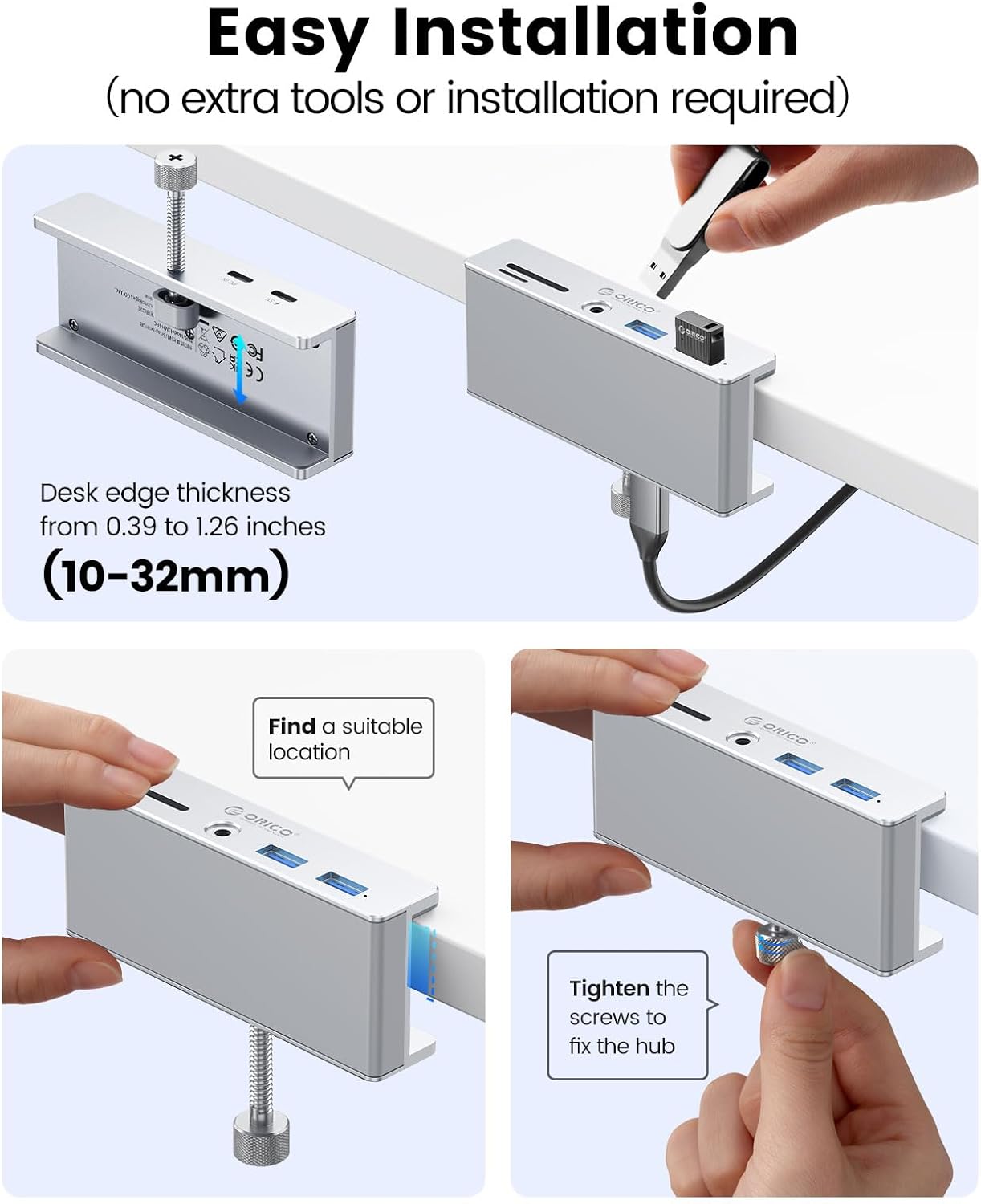 New Clampable Hub Design: ORICO mountable usb hub designed with adjustable screw allow you to mount monitor screen edge or desk edge thickness from 0.39 to 1.26 inches (10-32mm), It can be firmly fixed on the edge of the desktop or monitor for a semi-permanent mount, and will not shake or move when plugged in or out.The parts in contact with the desktop or monitor are covered with soft silicone pads to avoid scratches.