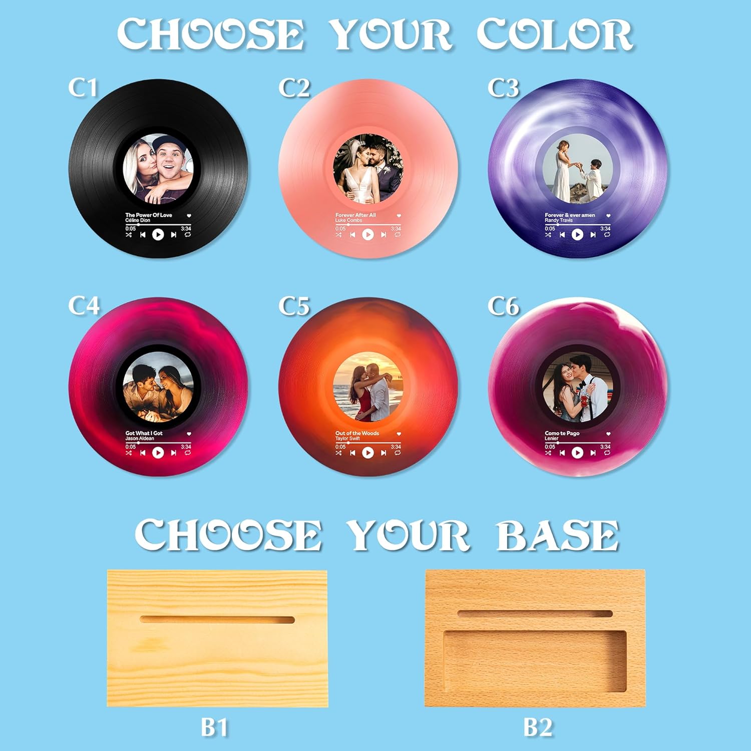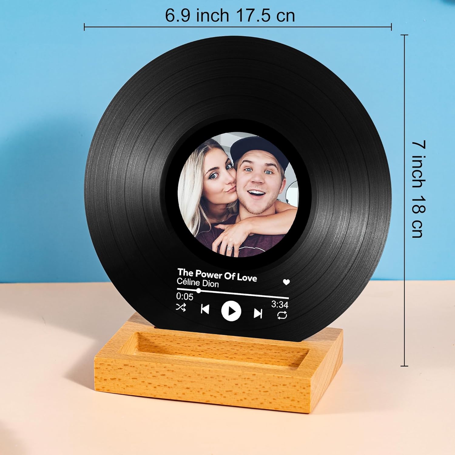 The Perfect keepsake for couples and music lovers, this personalized vinyl record decorative sign can be customized with your favorite photo, song title and artist name and is available in 6 vibrant colors.Made of high quality acrylic with high definition UV printing, this vinyl record measures 6.9 inches, this unique gift is ideal for celebrating a wedding, anniversary or special milestone. Wooden stand is available as an option. Please upload a clear, high resolution image for optimal print quality and enjoy this beautiful piece of home décor for years to come.