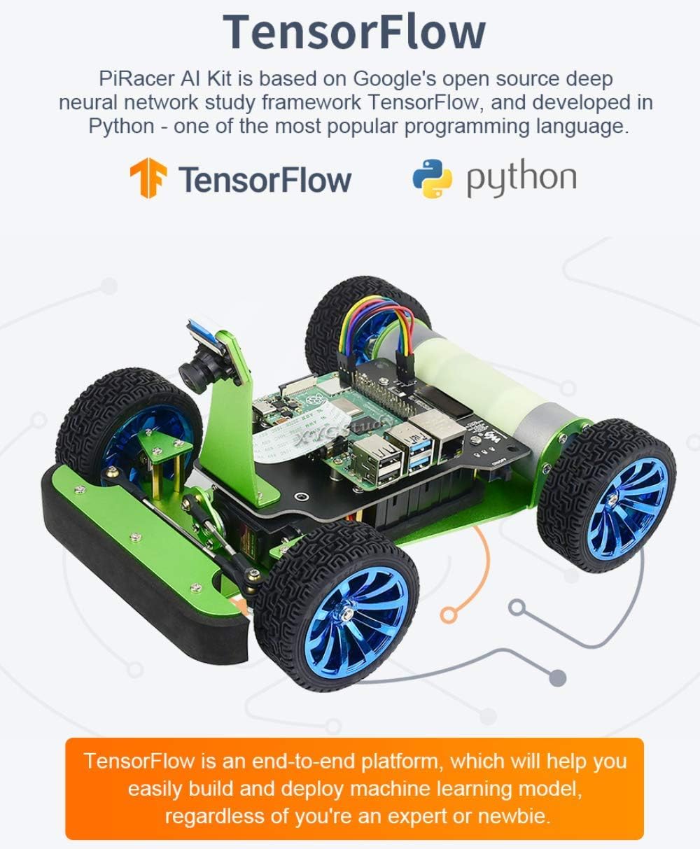 PiRacer AI Kit is based on Google’s open source deep neural network study framework TensorFlow, and developed in Python – one of the most popular programming language. TensorFlow is an end-to-end platform, which will help you easily build and deploy machine learning model, regardless of you’re an expert or newbie.