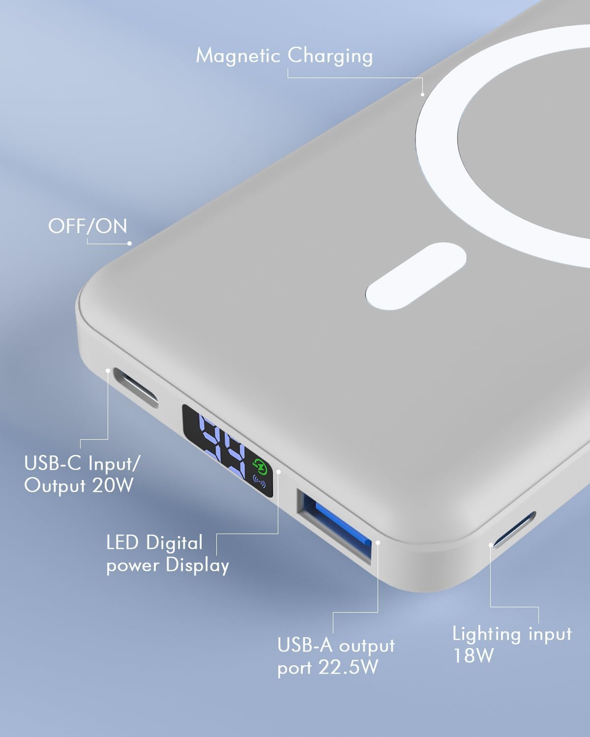 Strong Magnetic & Fast Charging Power Bank: Magnetic portable charger adopts the latest magnetic suction technology, charging immediately after snap. Support 5W, 7.5W, 10W and 15W Max wireless charging, 22.5W max USB-A PD output and max 20W USB-C output; Support max 18W Lighting input and max 18w USB-C input; The wireless charger can charge 3 Devices at the same time, shared charging with no waiting. The battery pack charger portable for iphone ensures faster charging speeds