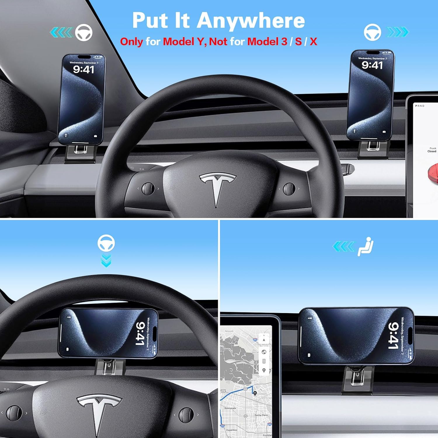Multi-position Mounting: Our phone holder for Tesla Model Y(EXCEPT for Model 3) has a base snap that precisely matches the dashboard air vent gap. Small snap of the modely mount can be mounted on the left side, also can be stuck on the right and center of the steering wheel, you can choose the appropriate location based on your needs to ensure a proper view. Also this dash phone mount for tesla y can be installed on the passenger side, letting your family enjoy hands-free phone convenience together