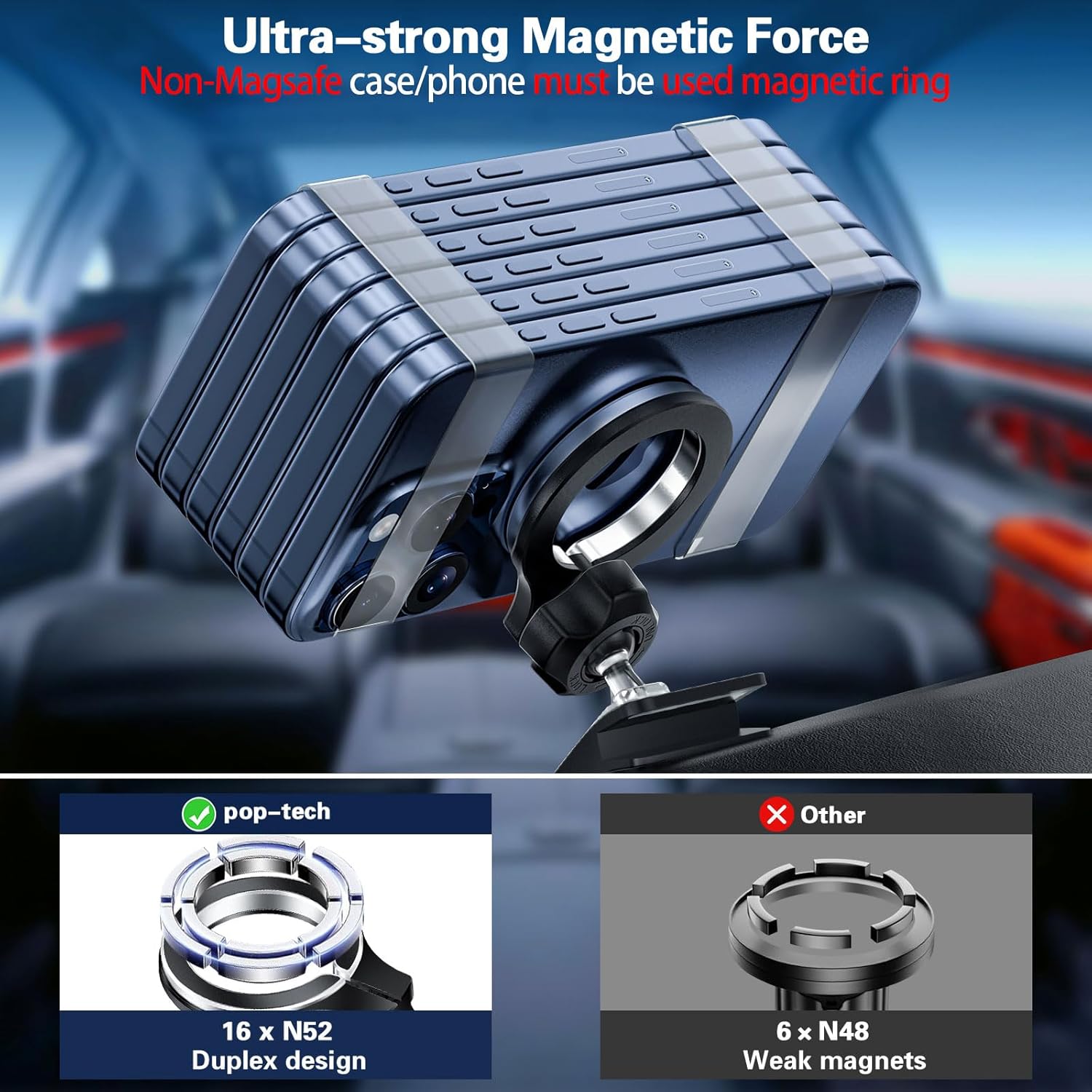 Compatible for MagSafe: pop-tech model y mag-safe mount features 16 enhanced N52 permanent magnets and a double-ring loop design, won’t interfere with signal, keeping navigation and calls open. Powerful magnetic holds phone securely on bumpy roads or sharp turns, giving you peace of mind while driving. The edge of magnetic phone mount for tesla model y is made of frosted metal, enhancing durability and stability. Hollow design of holder very fit socket grips and enhances phone cooling