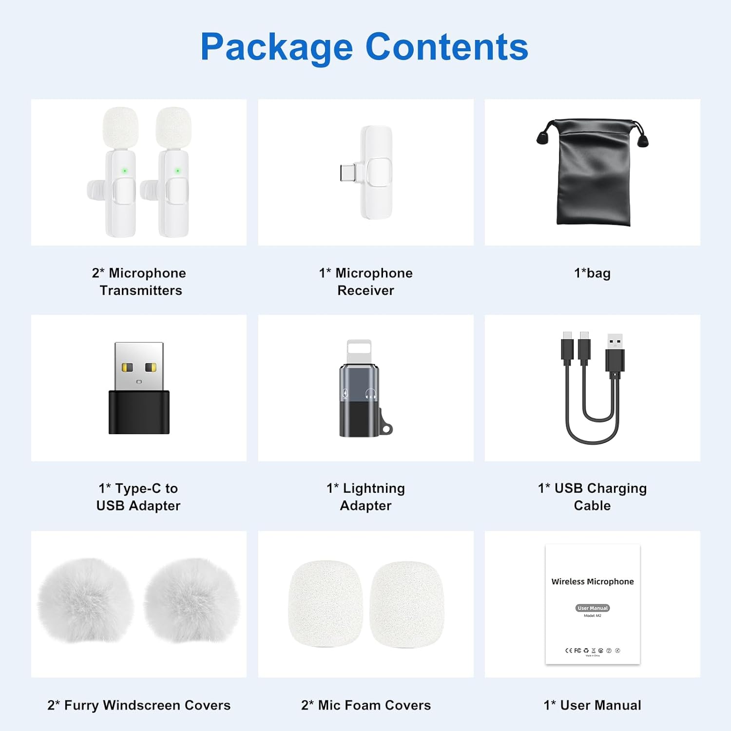 【Warmly tips】Come with 2 x wireless transmitters, 1*wireless receiver, 2*mic clips,1*lightning adapte,1* type-c to usb adapte,1*charging cable, and 1*user manual. We provide a one-year warranty. If you have any questions, please feel free to contact us.