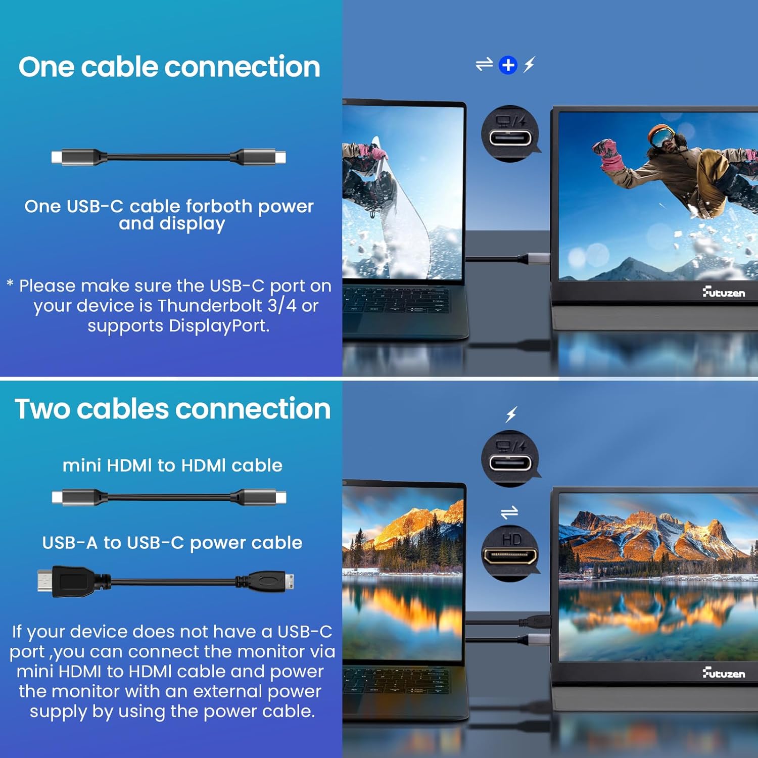 【Full HD Portable Monitor】— Futuzen 15.6inch portable laptop monitor with 1920*1080 resolution, advanced IPS screen support 178° full viewing angle, it renders accurate and bright color, draws you into the video or game with lifelike colors and amazing detail.It can effectively reduce blue light radiation damage, no flickering, eye-care, and make it easier to watch for a long time.A second monitor for working from home.