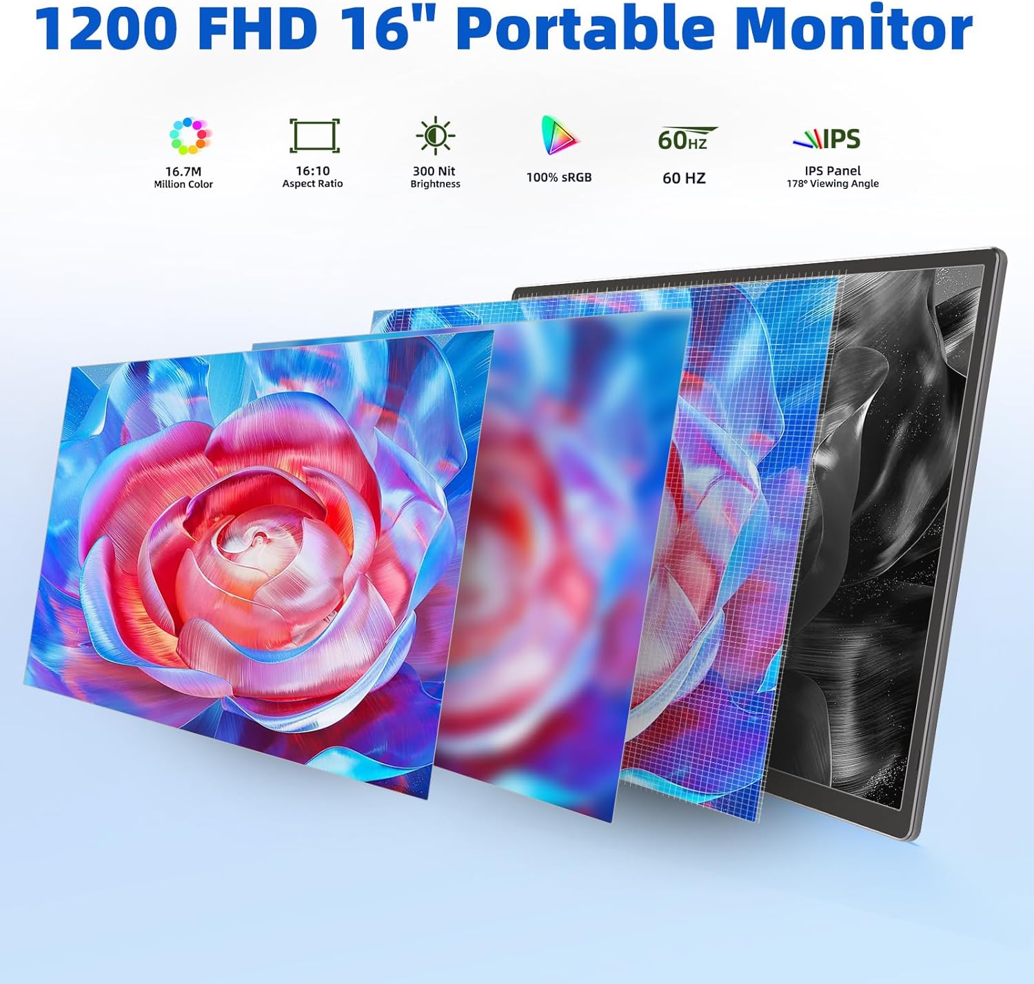 FHD IPS Display: Experience exceptionally sharp and comfortable viewing on a 16-inch anti-glare matte screen. With 300 nits brightness, 178° wide viewing angles. This monitor significantly reduces eye fatigue, perfect for long hours of work or gaming.