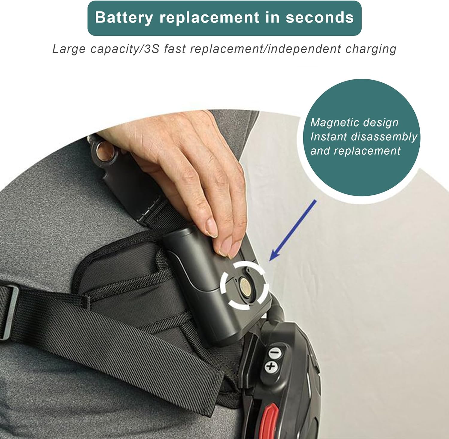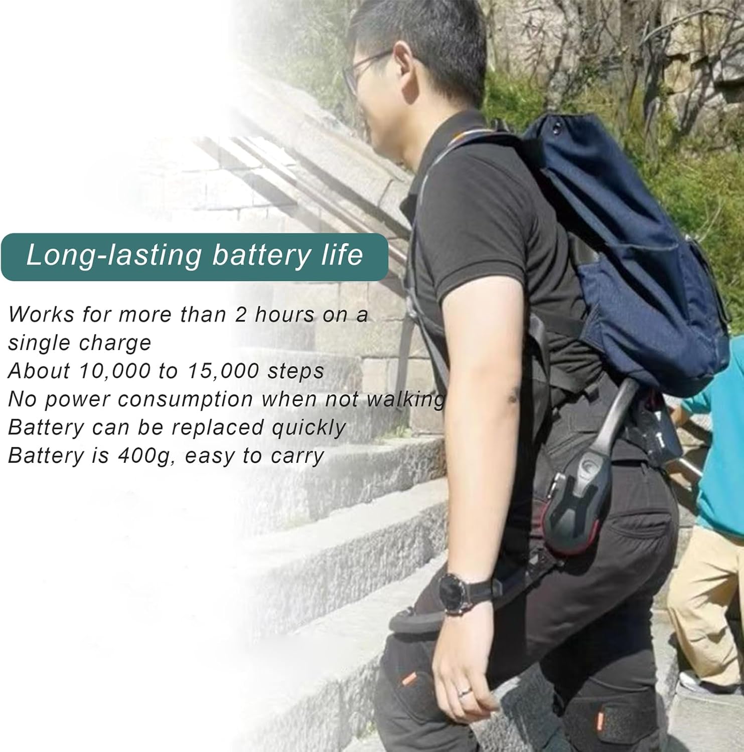 Quick-Swap Battery System: Replace 400g batteries in seconds for 2+ hours of continuous use (8,000–12,000 steps); zero power drain when idle, perfect for extended outdoor adventures.