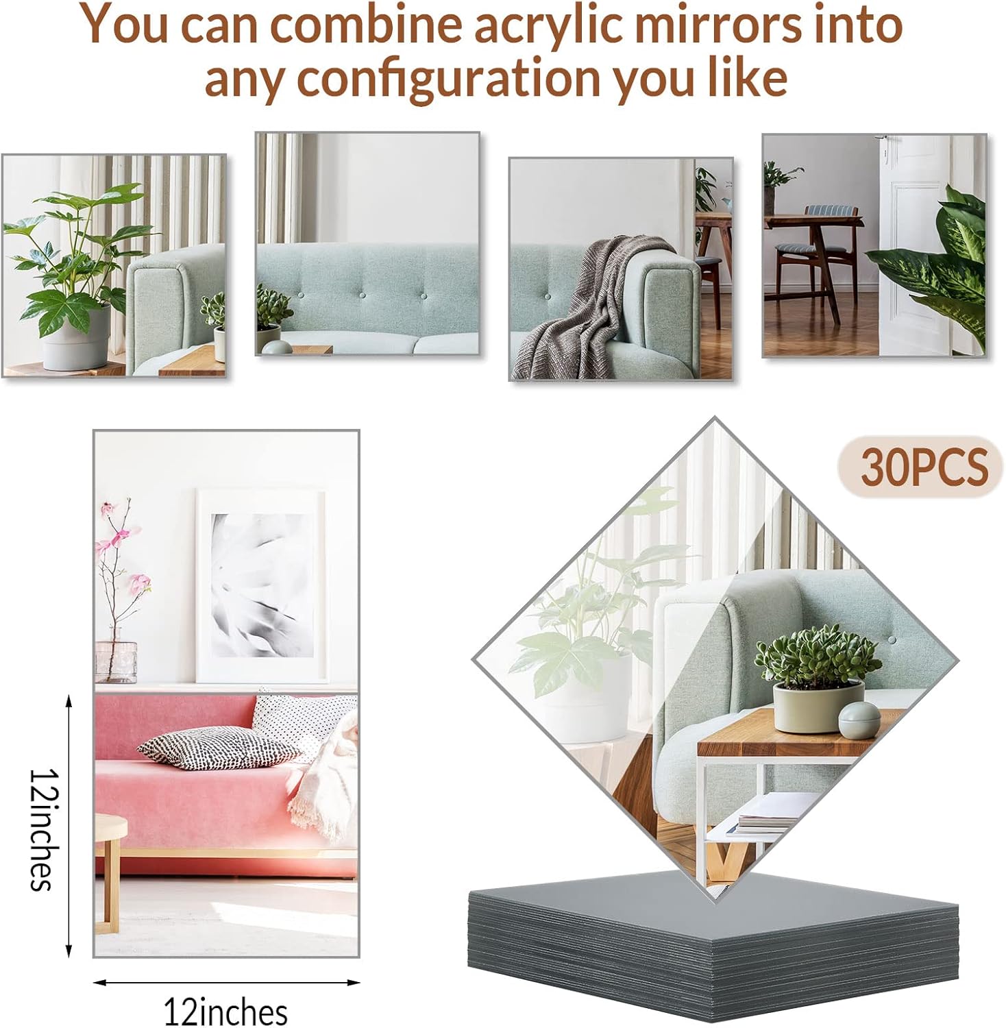 Sufficient for Needs: the package includes 30 pieces of wall acrylic mirrors and they measure about 12 x 12 x 0.08 inches/ 30.5 x 30.5 x 0.2 cm, enough quantity will meet your need for daily use, you can also use them to decorate your home