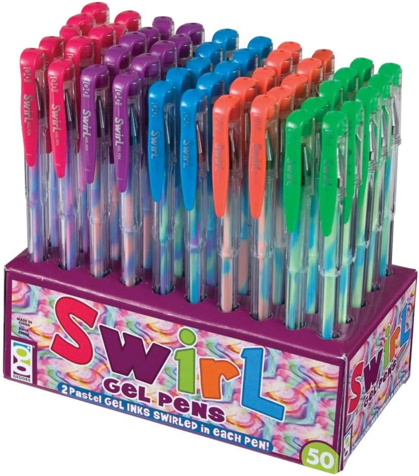 Raymond Geddes Multicolored Swirl Gel Pens are fun and adorable stationery supplies. Each 50 pack includes 5 kinds of color combinations: blue, pink, orange, green, and purple. The gel ink pens feature 2 gel inks in each pen and do not merge and stay in colorful swirls. The pens are perfect for arts and crafts, scrapbooking, yearbooks, and school projects. At Raymond Geddes, we make our mission to supply students and adults with imaginative and affordable pens, pencils, mechanical pencils, erasers, and other school supplies designed for school stores, classrooms, and education fundraising.