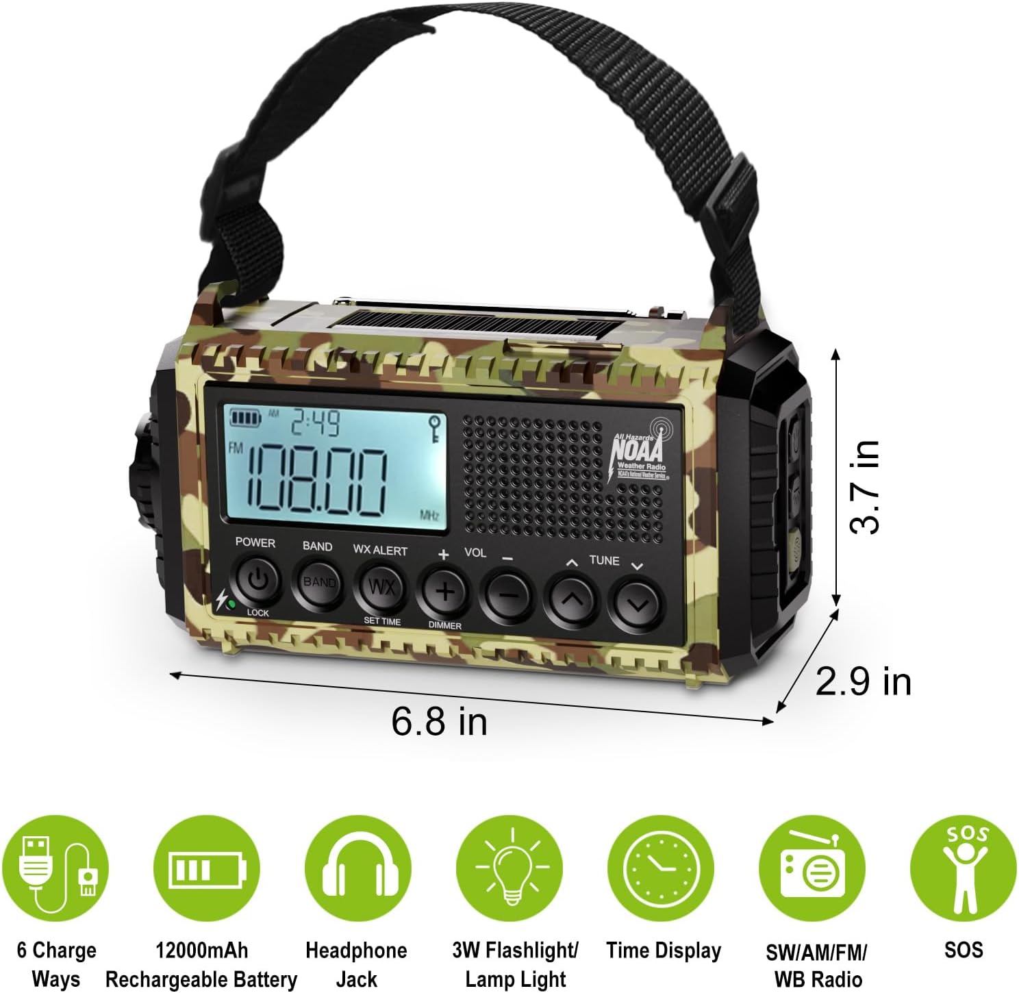 Product Summary: Raynic Weather Radio, 12000mAh Hand Crank Emergency Radio, 6 Ways Powered AM/FM/SW/NOAA Weather Alert Radio with Flashlight, Cell Phone Charger and SOS Siren for Power Outages (Camo-Green-LCD Display)