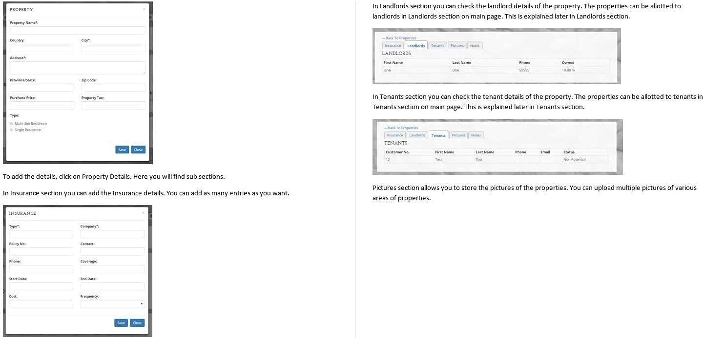 Store building and property information including insurance, notes, pictures and details Manage Lists of landlords, tenants, rooms, apartments down to the street level Easily manage landlords and Vendor details