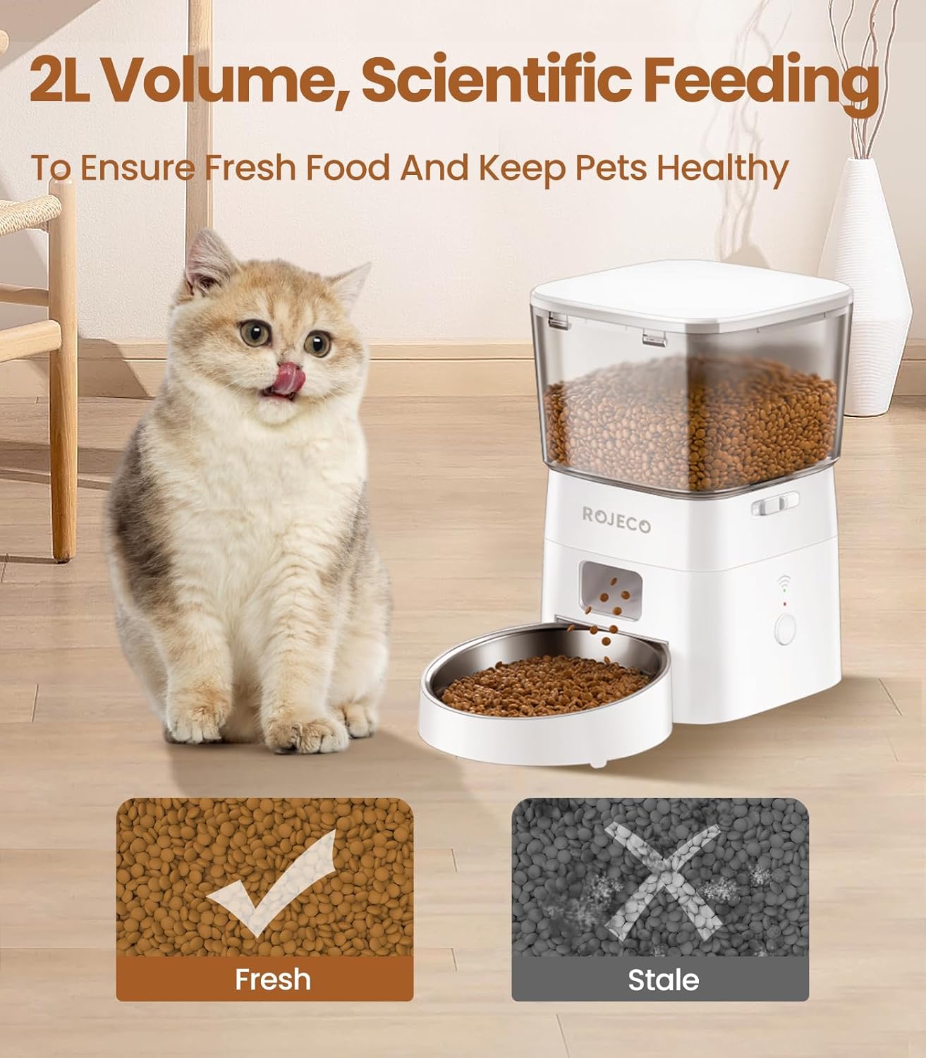 【Smart Feeding Plan】ROJECO automatic cat feeder can connect the WiFi (Only supports 2.4GHz WiFi networks),When you are on business trip or working overtime, you can easily set the feeding plan remotely,Solve your feeding worries through the ROJECO APP.provide more convenient life for you and your pets