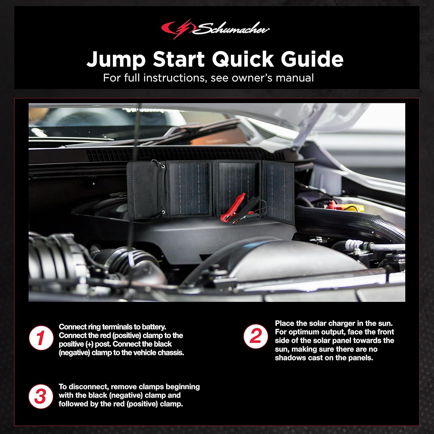 IN THE BOX: Schumacher SA1658 8W 12V Portable Solar Battery Trickle Charger, quick-connect battery clamps, and user manual