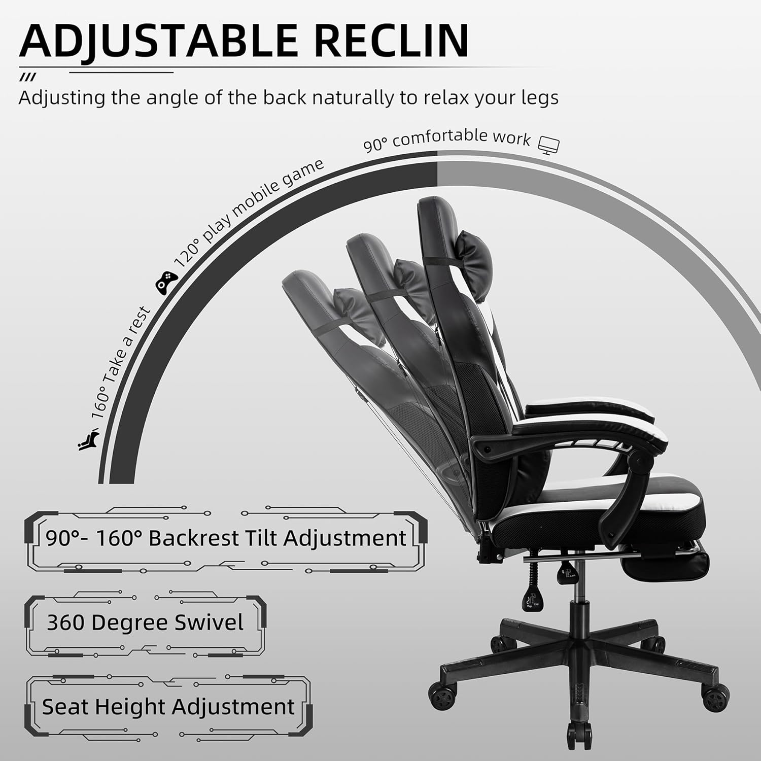Shintenchi Gaming Chair,Video Game Chair with footrest and Massage Lumbar Support,Height Adjustable Game Chair with 360°Swivel Seat Ergonomic Computer Chair with Headrest for Office or Gaming(White)