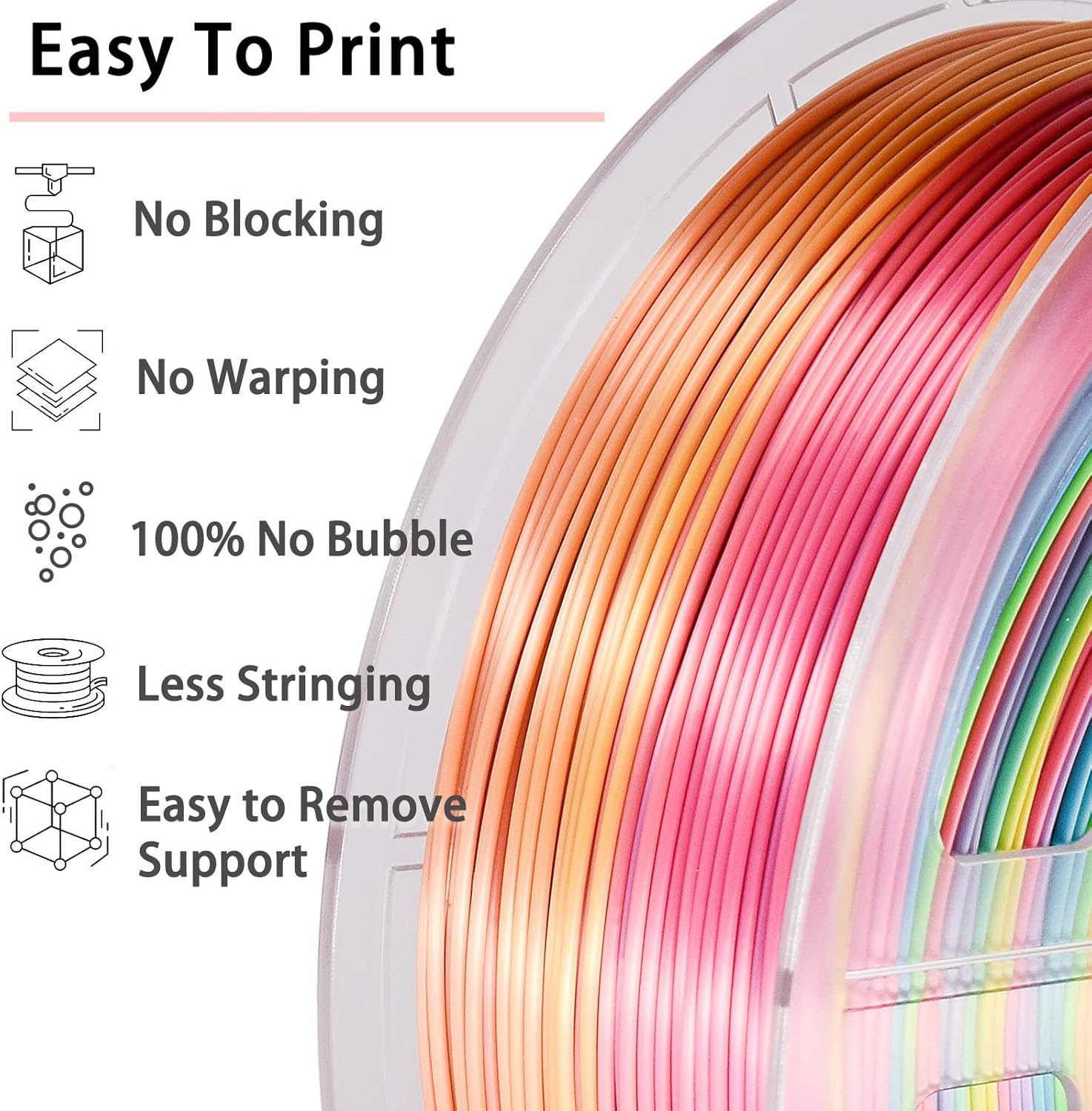 PLA FILAMENT SILK MULTICOLOR – Fast 5 colors change with blue, green, yellow, pink and purple , so you can get all colors in one object-about 200g. The color transition is natural and beautiful and the silk filament has excellent gloss.
