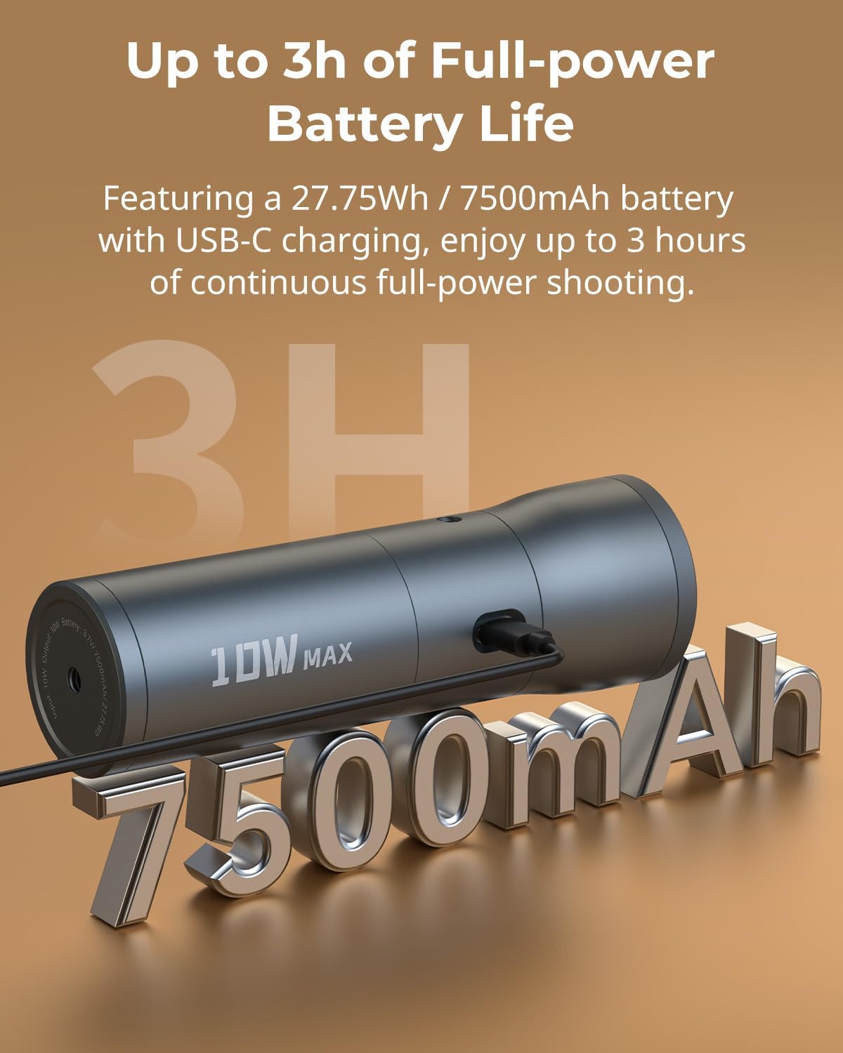 【Long-lasting Battery Life】Equipped with a built-in 27.75Wh lithium battery that supports USB-C charging, this light provides approximately 3 hours of continuous full-power lighting, ensuring uninterrupted support for your shooting needs.