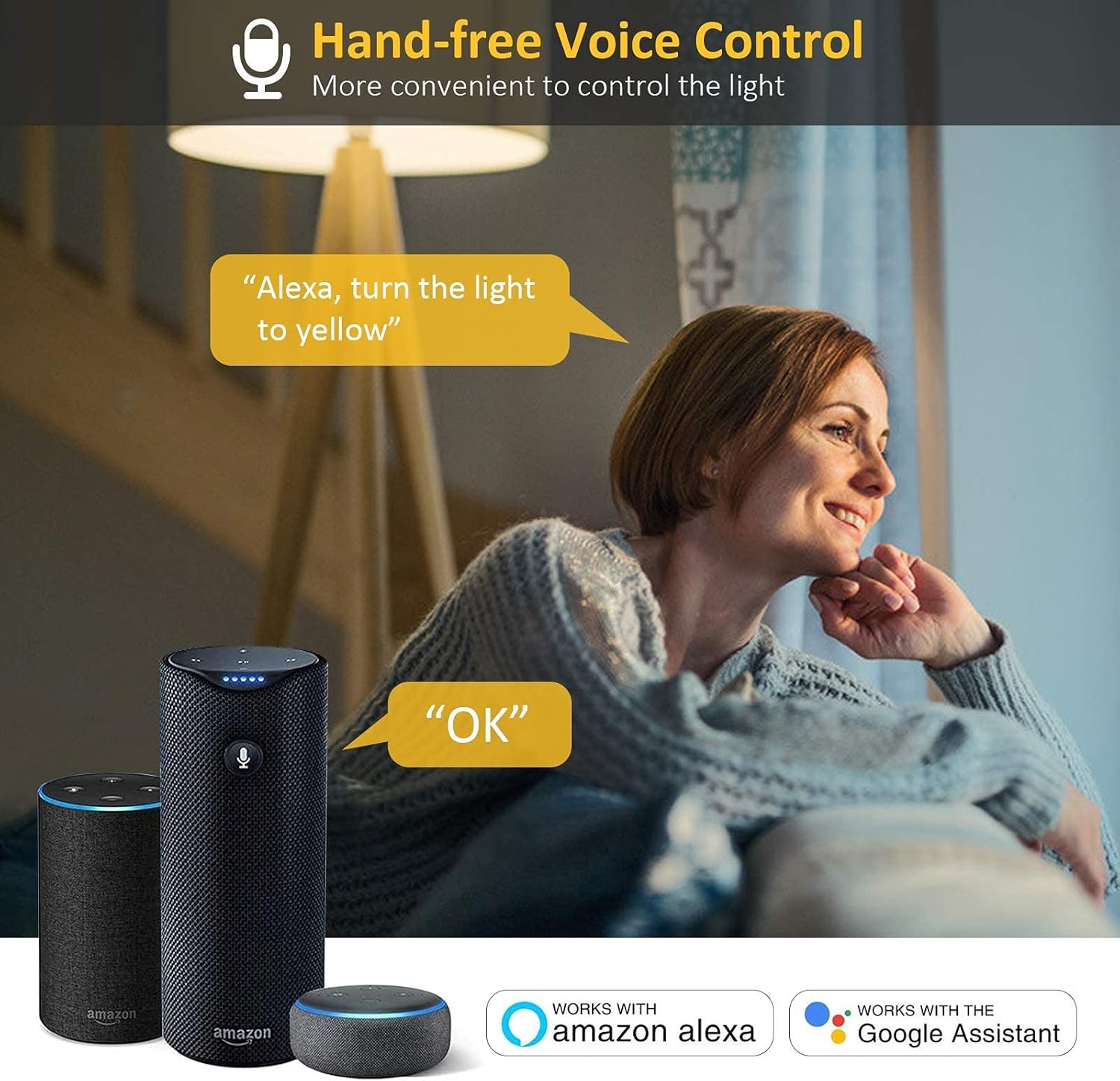 [5 Control Modes] Integrated with 5 basic control modes: 1) Remote control: control smart bulbs anywhere with Wi-Fi alive. 2) App control. 3) Voice control: command light by voice. E.g: Alexa, turn on smart bulbs in living room. 4) Individual/group control: individually or in groups modify settings of different functions of smart bulbs. E.g: Of one bulb or more, convert the switch, change colors, dim brightness, or tune saturability. 5) Control smart bulbs via Alexa, Google home assistant, Echo.