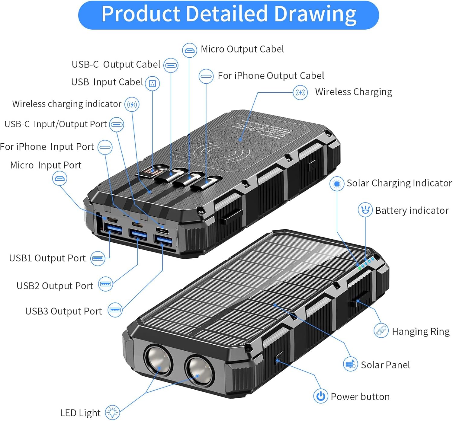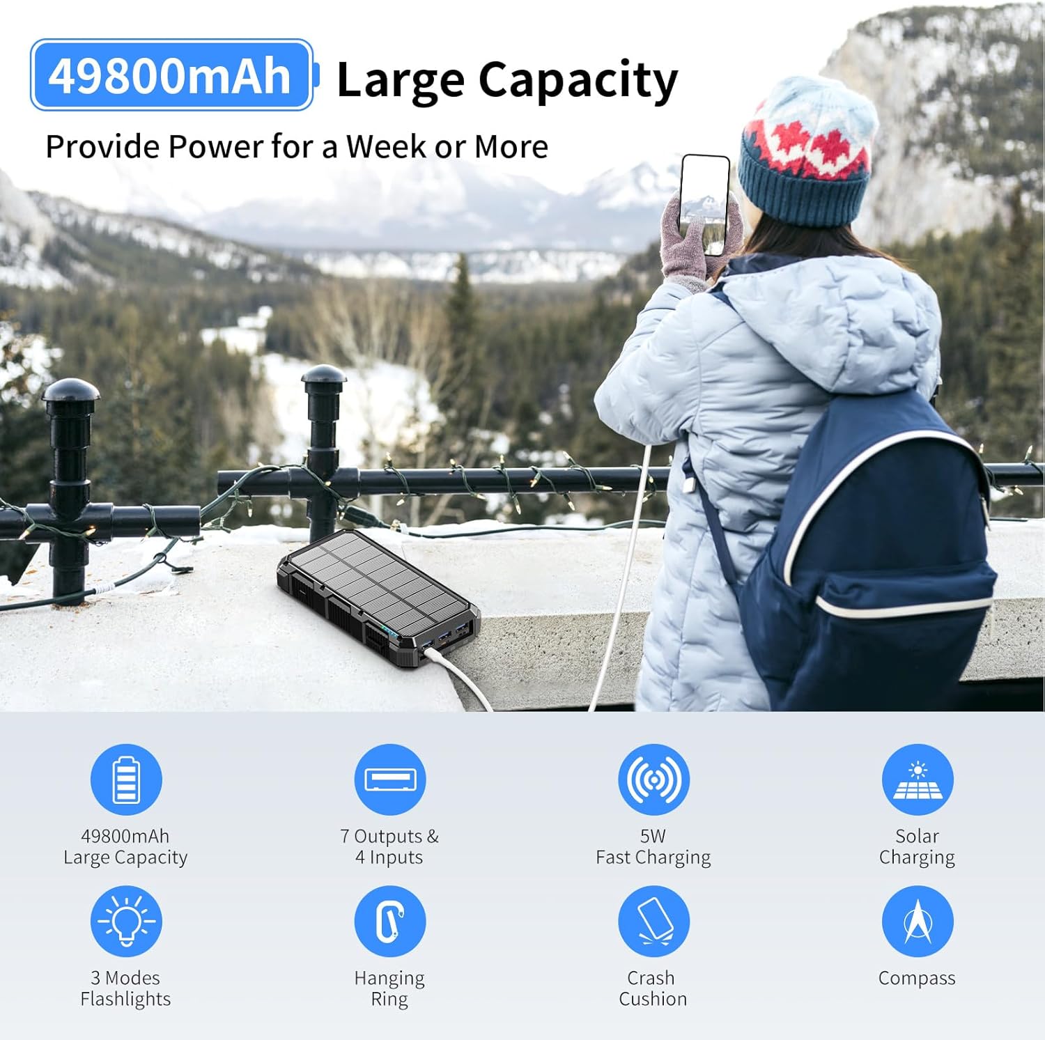 【49800mAh HUGE CAPACITY】Boasting a 49800mAh premium Li-polymer battery, this solar power bank can charge your devices multiple times. Recharge it via an adapter or solar panel, eliminating worries about running out of power. The smart protection IC chip ensures intelligent charging safety.