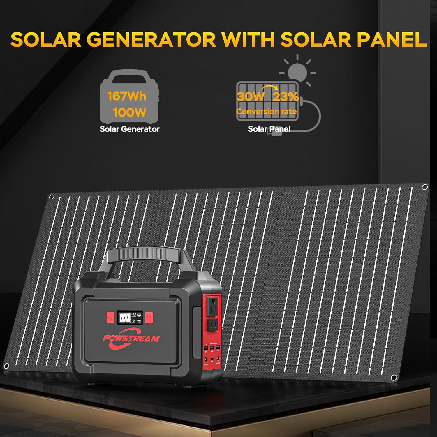 【Solar Generator with Solar Panel】The POWSTREAM solar panel 30W and power station P168 combine to provide a reliable power source for overnight stays outdoors or extended periods away from home. Perfect for tent camping, road trips, and other outdoor activities that require electric power