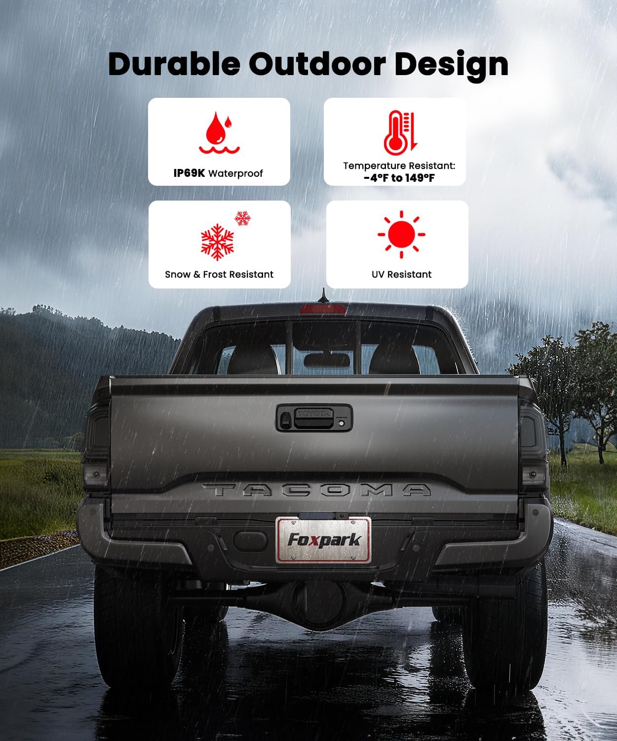 IP69K Waterproof Protection: Ready for rain or shine. The backup camera for car’s sealed housing blocks water, dust, and fog buildup, preventing short circuits and blurred images after storms or car washes. With IP69K-rated protection, it delivers clear, reliable views in every season for long-lasting performance outdoors