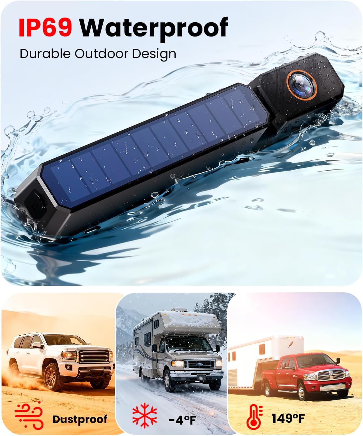 Dual Antennas for Strong Signal: Drive and park with confidence. The upgraded dual-antenna design strengthens the wireless connection between the solar backup camera and monitor, cutting lag and signal drops even across long vehicles or busy parking lots. Enjoy a smooth, real-time rear view that stays clear every time you reverse, tow, or park