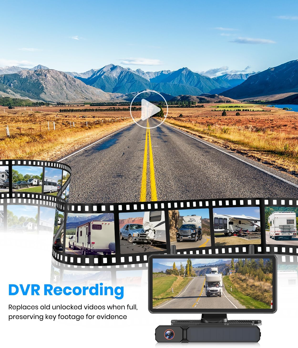 DVR Recording with 7.2” HD Screen: Capture every moment on the road. The built-in DVR in this backup camera system for trucks built-in DVR continuously records your driving and reversing footage in clear 1080P, so important details are never lost. View or replay videos directly on the wide 7.2-inch monitor without extra devices. Whether parking in tight spots or driving long distances, it keeps visual evidence ready for greater peace of mind