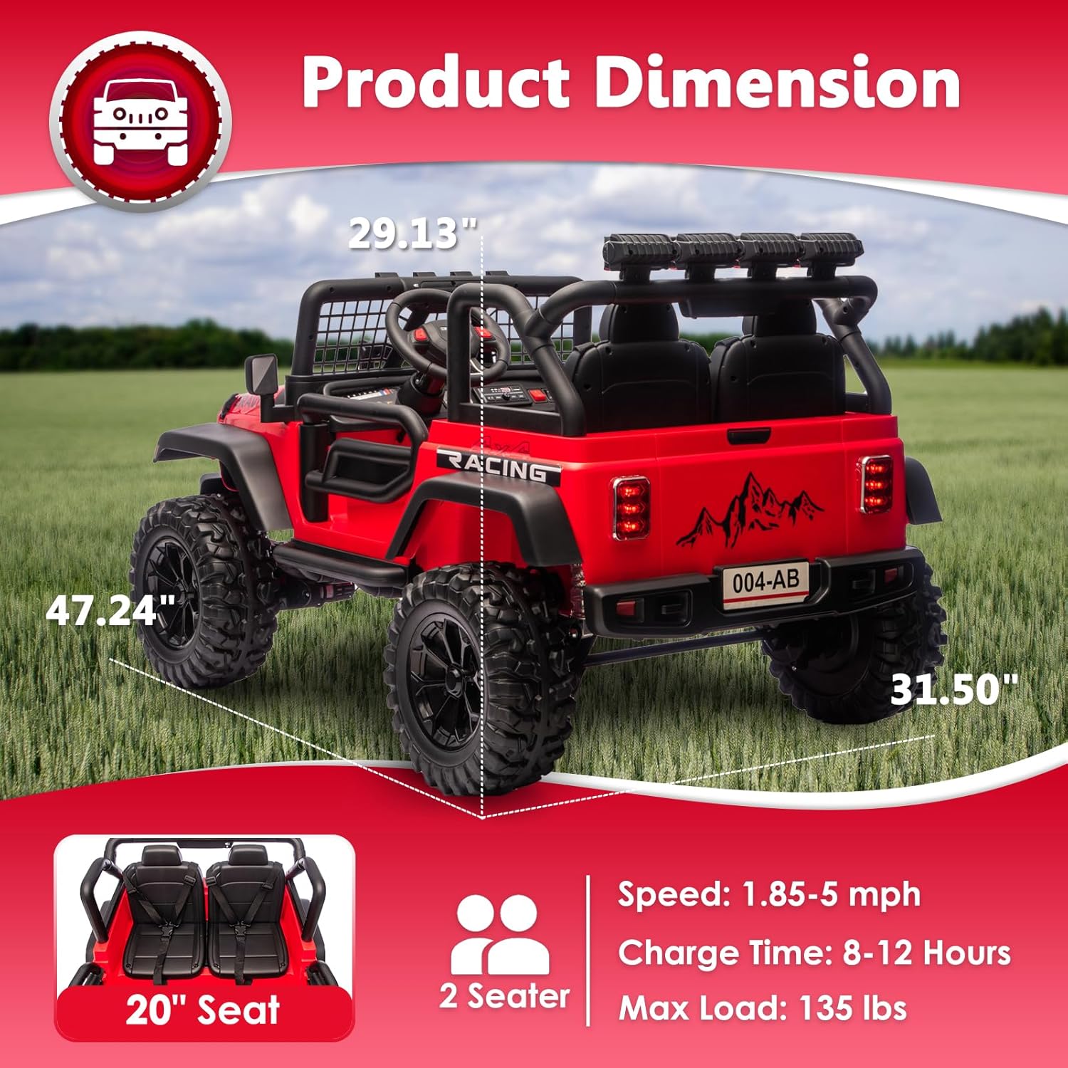 KIDS RIDE ON CAR WITH THREE-POINT SEAT BELT: This 24-volt ride on truck is designed with a widened seat and adjustable seat belt. The seat belt is a new three-point seat belt to ensure that your child can more easily cope with various extreme situations during the vehicle. The load-bearing capacity of this electric scooter: 135 pounds; Product size: 47.24″ x 31.50″x 29.13″
