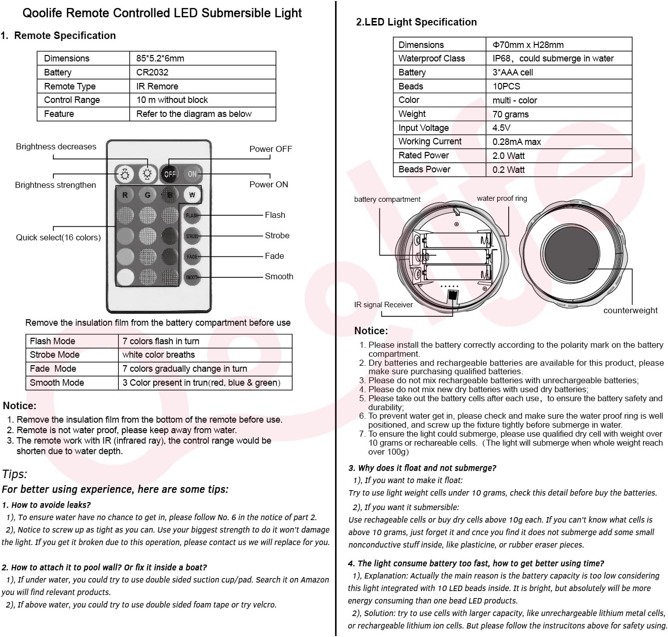 This submersible lights operated by 3 x AAA batteries (not included, lasts 10-12 hours with qualified dry batteries), 16 different static modes, 4 dynamic color changing modes. Submersible, battery operated, IR remote control, dimming and ON/OFF. (Warm Tip: The remote is not waterproof, please keep it away from water)
