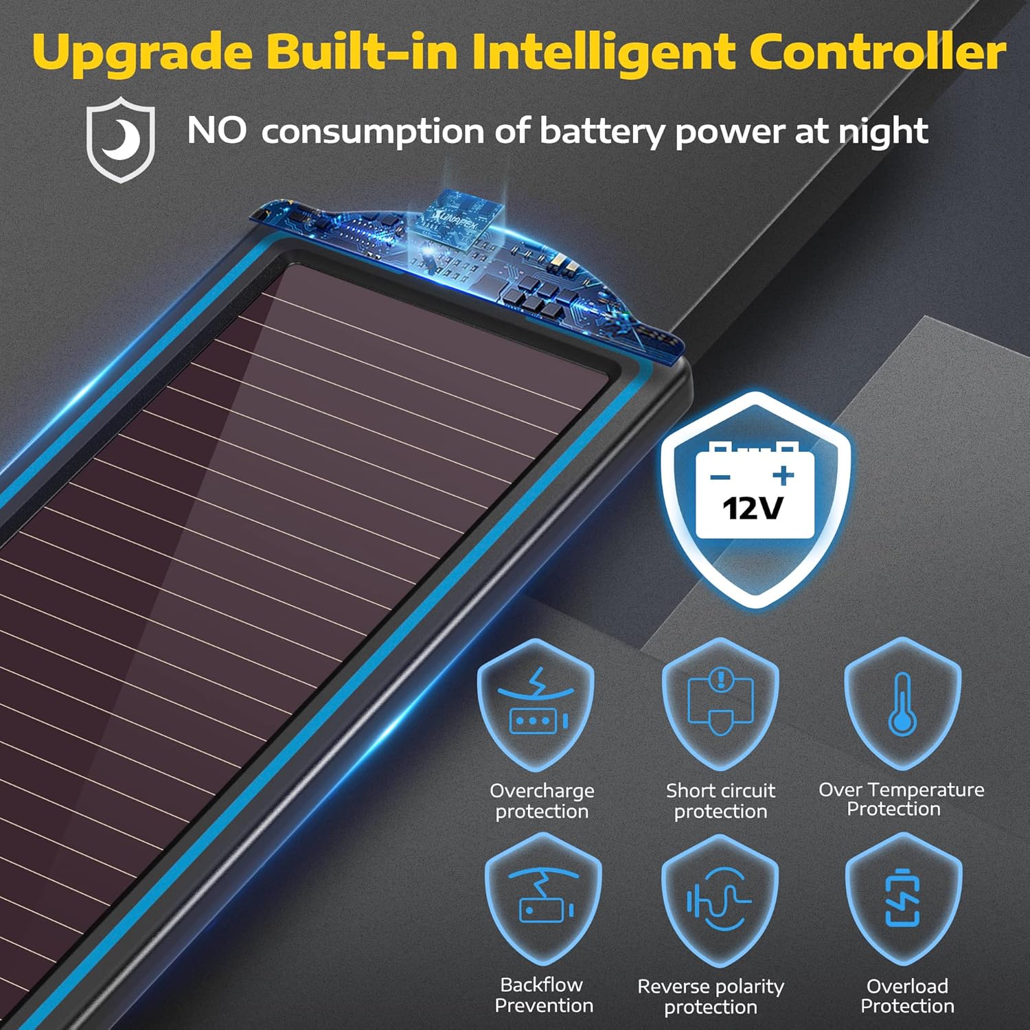 No Overcharging, No Battery Drain: The solar panel features a built-in controller that prevents overcharging. When the battery is full, the controller stops charging automatically and resumes when the voltage drops. Plus, our solar panel system won’t drain your battery