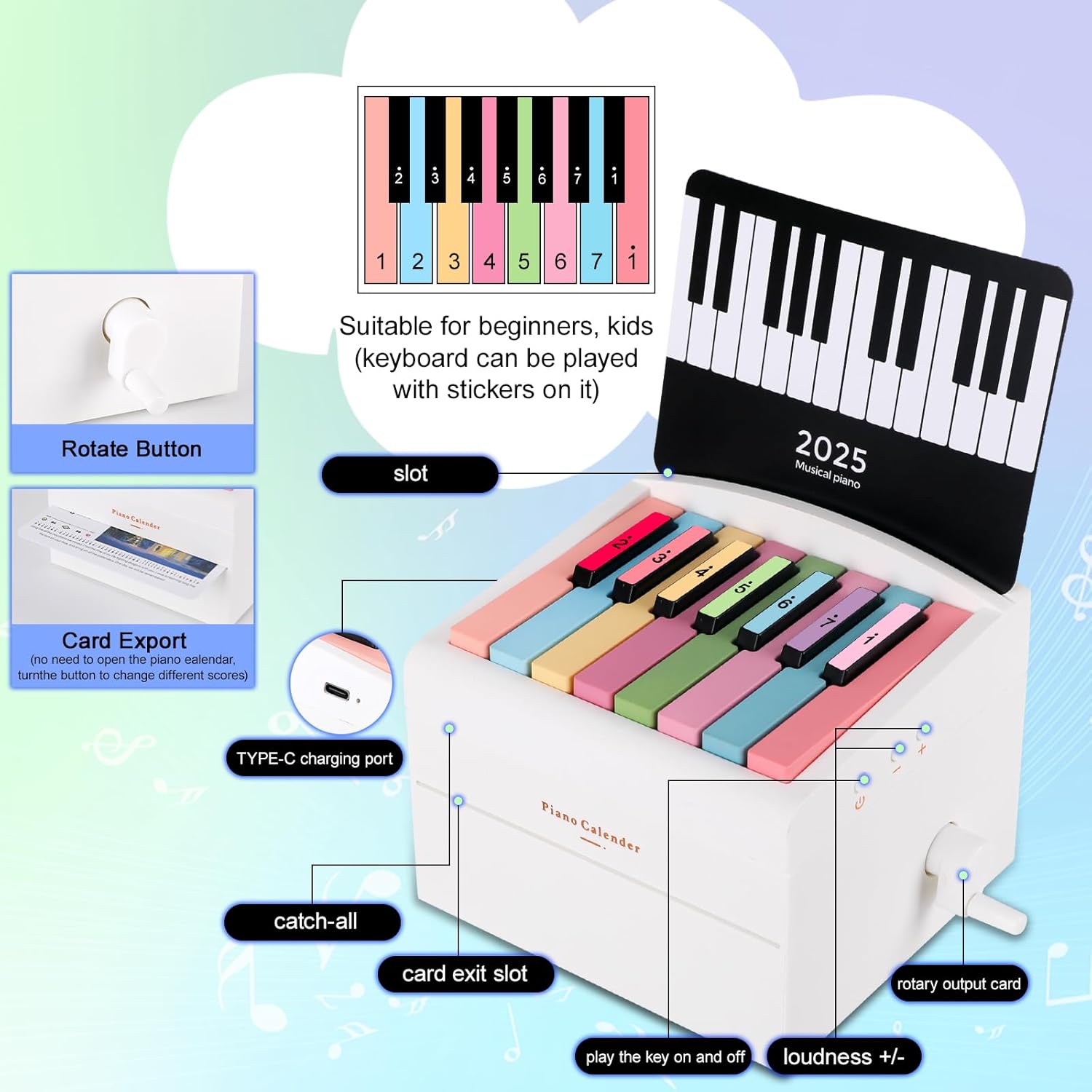 Innovative Design: Put the calendar card into the box and turn the right handle to bring out the next card. Play the corresponding track according to the sheet music on the card. The buttons on the side can adjust the playing volume