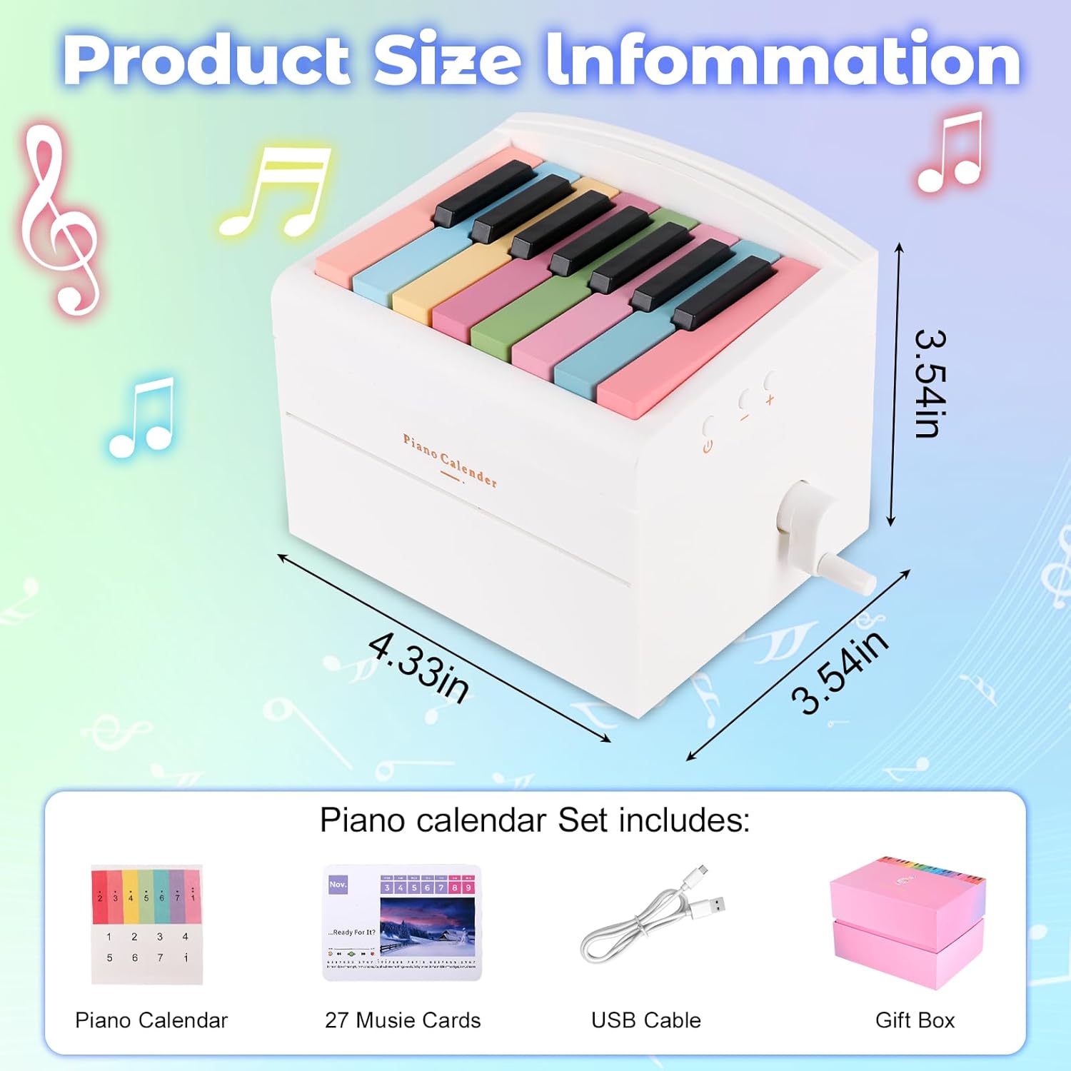 Package Includes: 1 x piano calendar, 27 x music cards, 1 x USB cable, 1 x gift box