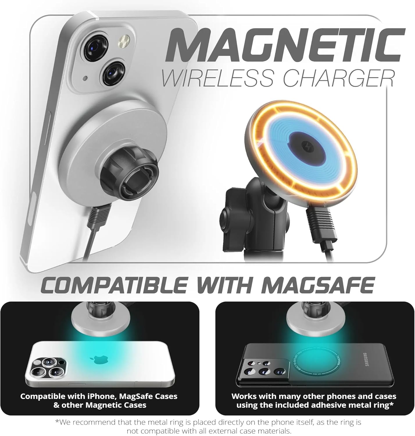 COMPATIBLE WITH MAGSAFE AND BEYOND: Whether you have the latest device or a phone case compatible with MagSafe, our newly designed wireless charging magnetic phone mount offers an ultra-secure, convenient attachment solution that is both no-slip and non-marring. For devices that aren’t compatible with MagSafe, we’ve included a sleek adhesive metal ring, allowing you to enjoy the same reliable magnetic hold with all the benefits of wireless charging.