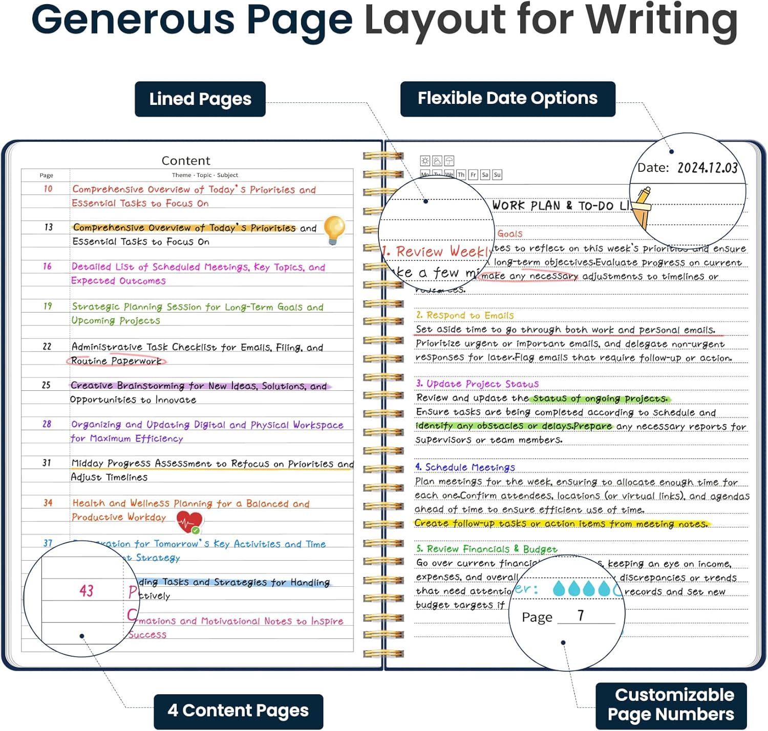 Customizable Pages & Table of Contents: Includes 4 table of contents pages to keep your notes organized and easy to reference. Contains 50 sheets/100 lined pages that allow you to write on both sides, each page allows you to customize page numbers and dates, making it the ultimate notebook for you.