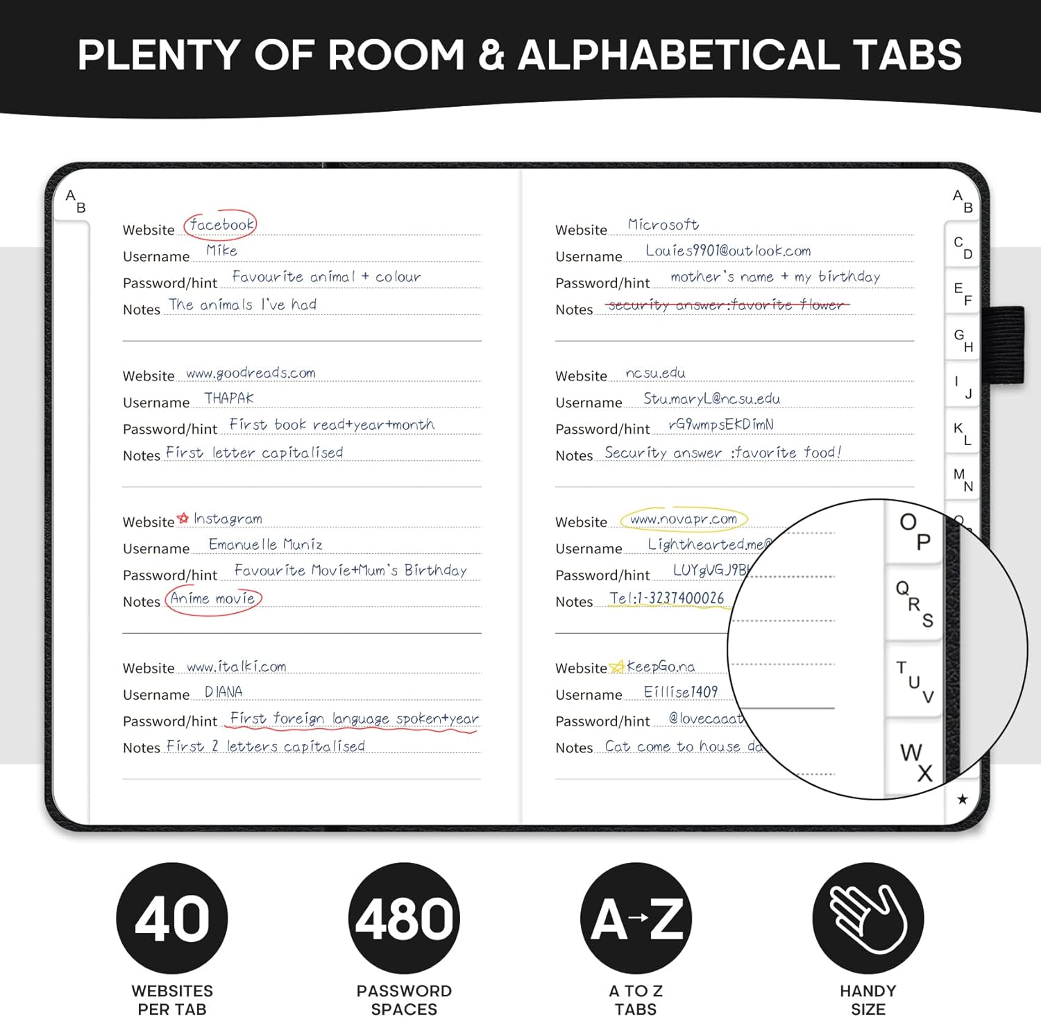 Easy-to-Find Passwords – Our password book with alphabetical tabs helps you quickly and easily find the password you need. With the alphabetically organized tabs, you can easily flip to the right section, saving you time and hassle searching for passwords.