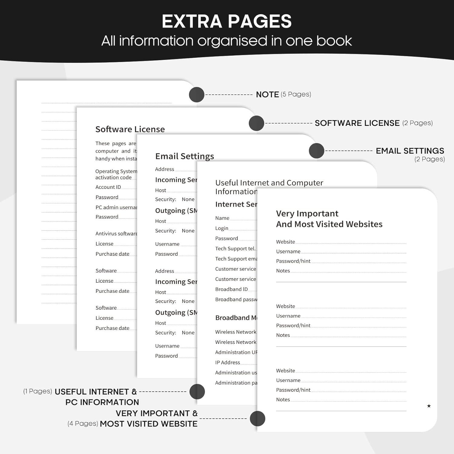 Plenty of Room To Write – This 136-page password logbook provides ample space to record your passwords and other important information. It can store up to 480 passwords, as well as details for one wireless router and your internet service provider. In addition, you can record up to four email accounts, eight software licenses, and eleven crucial websites. Finally, the logbook includes four pages for additional notes.