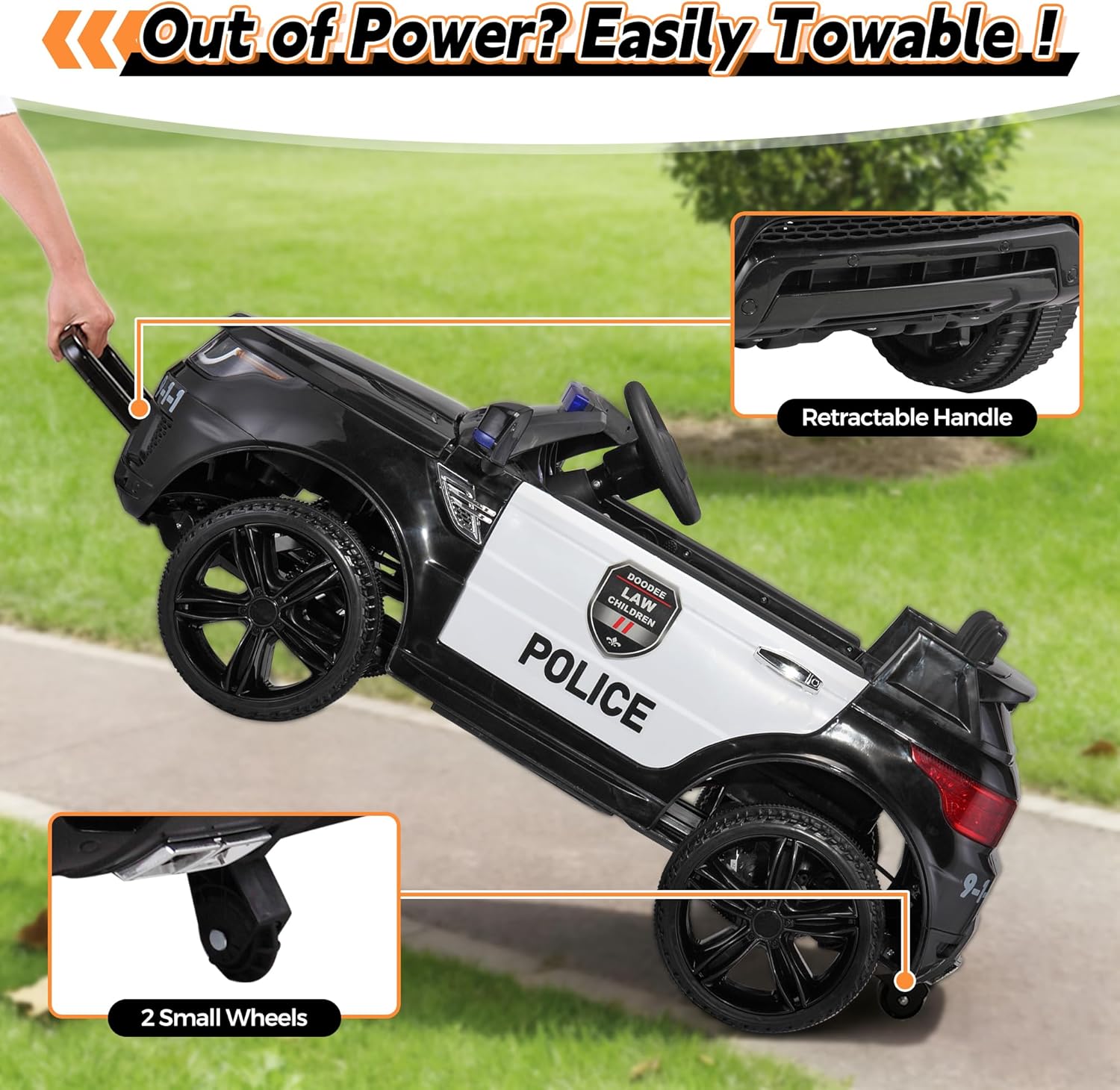 🚓【 Friendly Design】a. The retractable handle and wheels make it easy to move when it is not running.b. The ride on police car adopts shock absorber spring, minimizing the shock feeling and ensuring a smooth driving