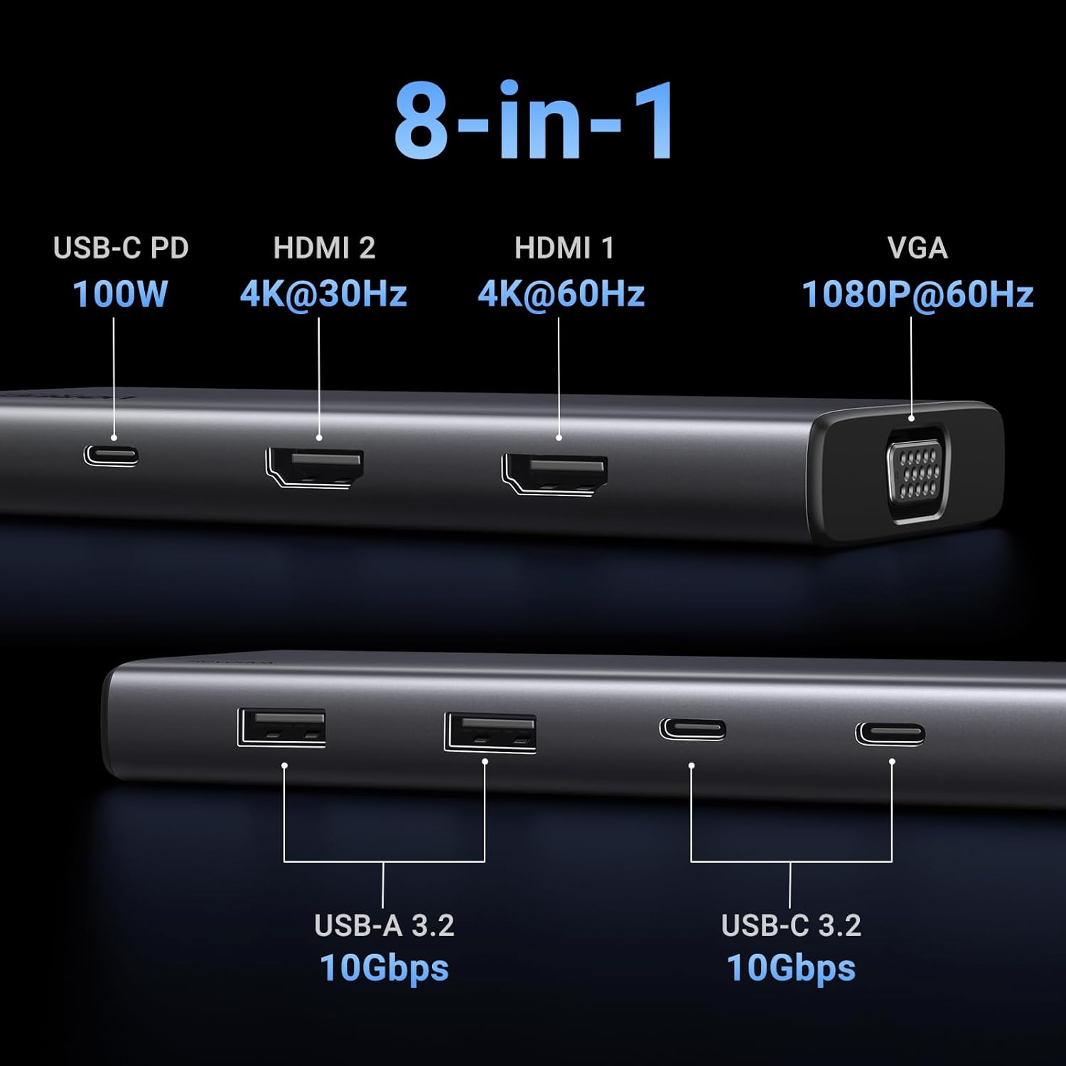 8 in 1 USB C Laptop Docking Station:Ugreen triple docking station equips with two 4K HDMI ports, a 1080p VGA port, two 10 Gbps USB-C 3.2 Gen 2 ports, two 10 Gbps USB-A 3.2 Gen 2 ports, 100W Power Delivery