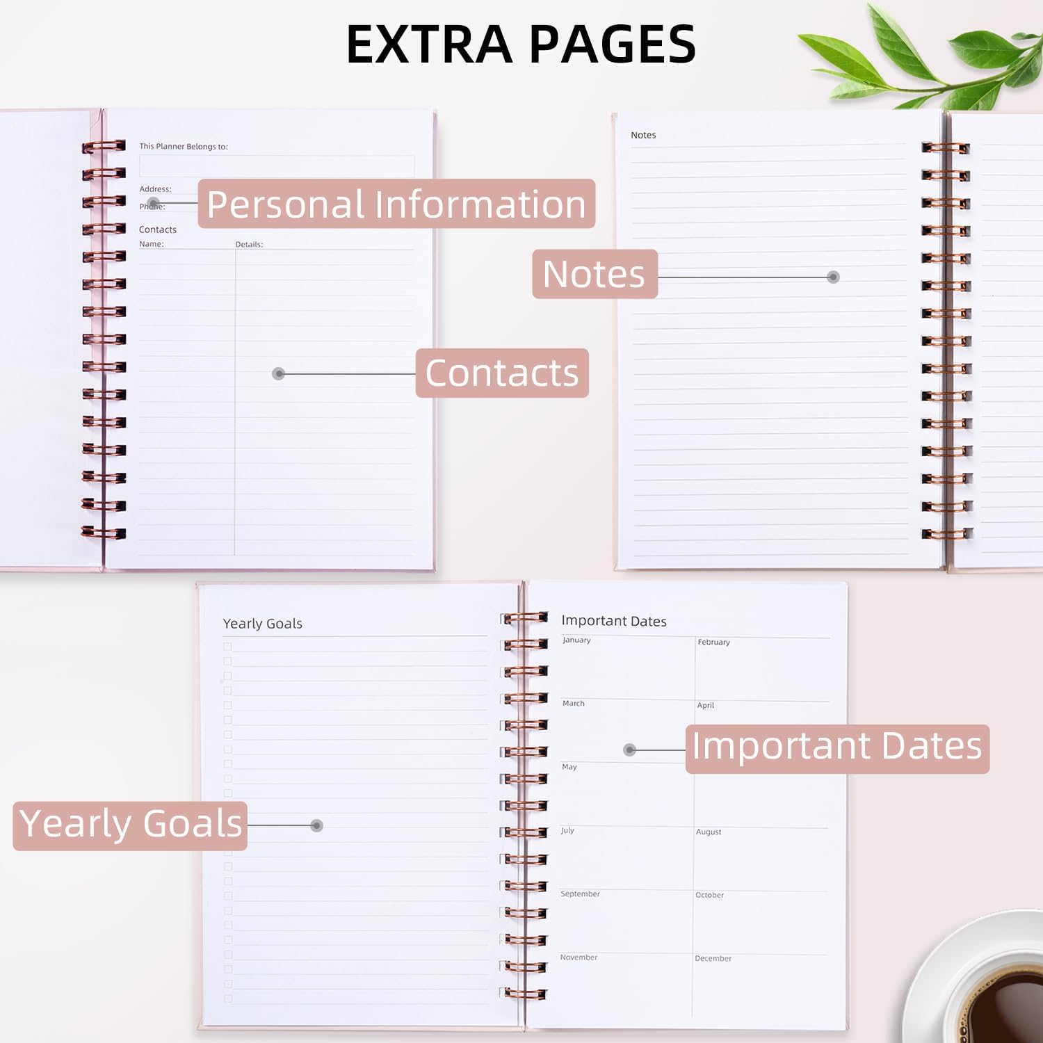 Inner Pocket, Notes & Extras – This planner is equipped with a small inner pocket for storing small items and includes a variety of useful pages to keep you organized. It features contacts pages, yearly goals pages, important dates pages, and extra notes pages to accommodate your scheduling needs.