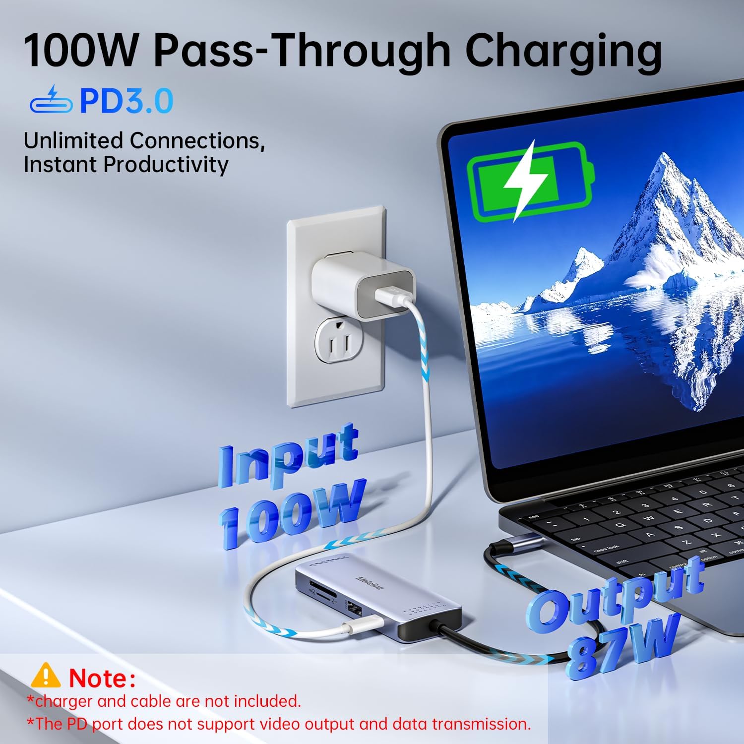 【USB C Card Reader & 100W Power Delivery】The laptop docking station supports up to 100W input and 87W output (safe) to charge your laptop at any time. Note: Ensure your laptop’s USB-C port supports power delivery and use a 65W (minimum) power adapter (not included) for charging. Using a lower-wattage charger may trigger a system warning. Power cord not included.