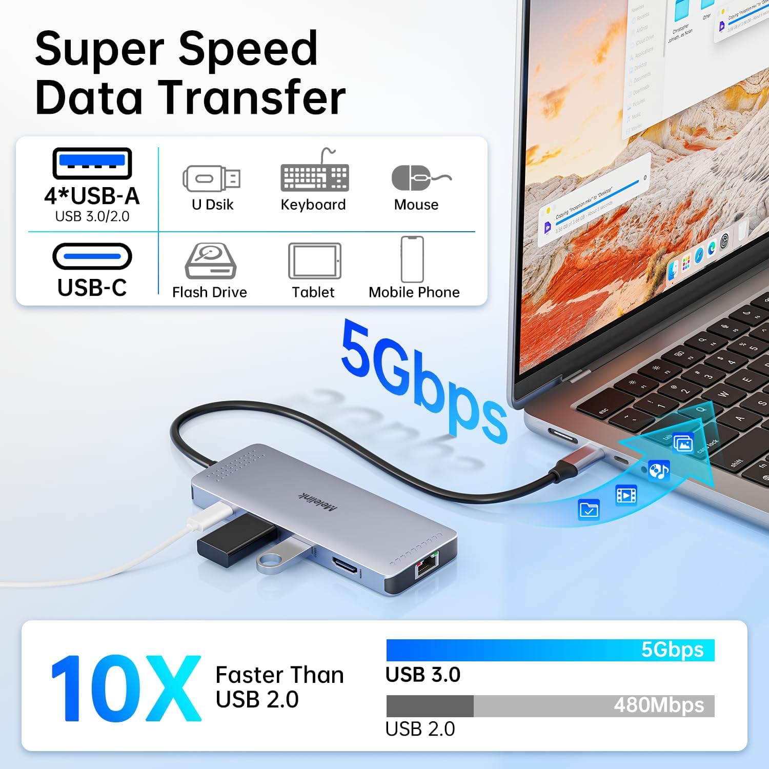 USB C Hub Multiport Adapter (10 IN 1): This multifunctional usb c to hdmi adapter equipped with 1 x 4K @60Hz HDMI, 1 x Ethernet port, 100W PD Port, 3 x USB A&C 3.0 (5 Gbps), 3 x USB 2.0 ports and SD/Micro SD card reader slot. This usb c adapter is an ideal gadget for most laptops,tablets with thunderbolt 3/4 type c port.