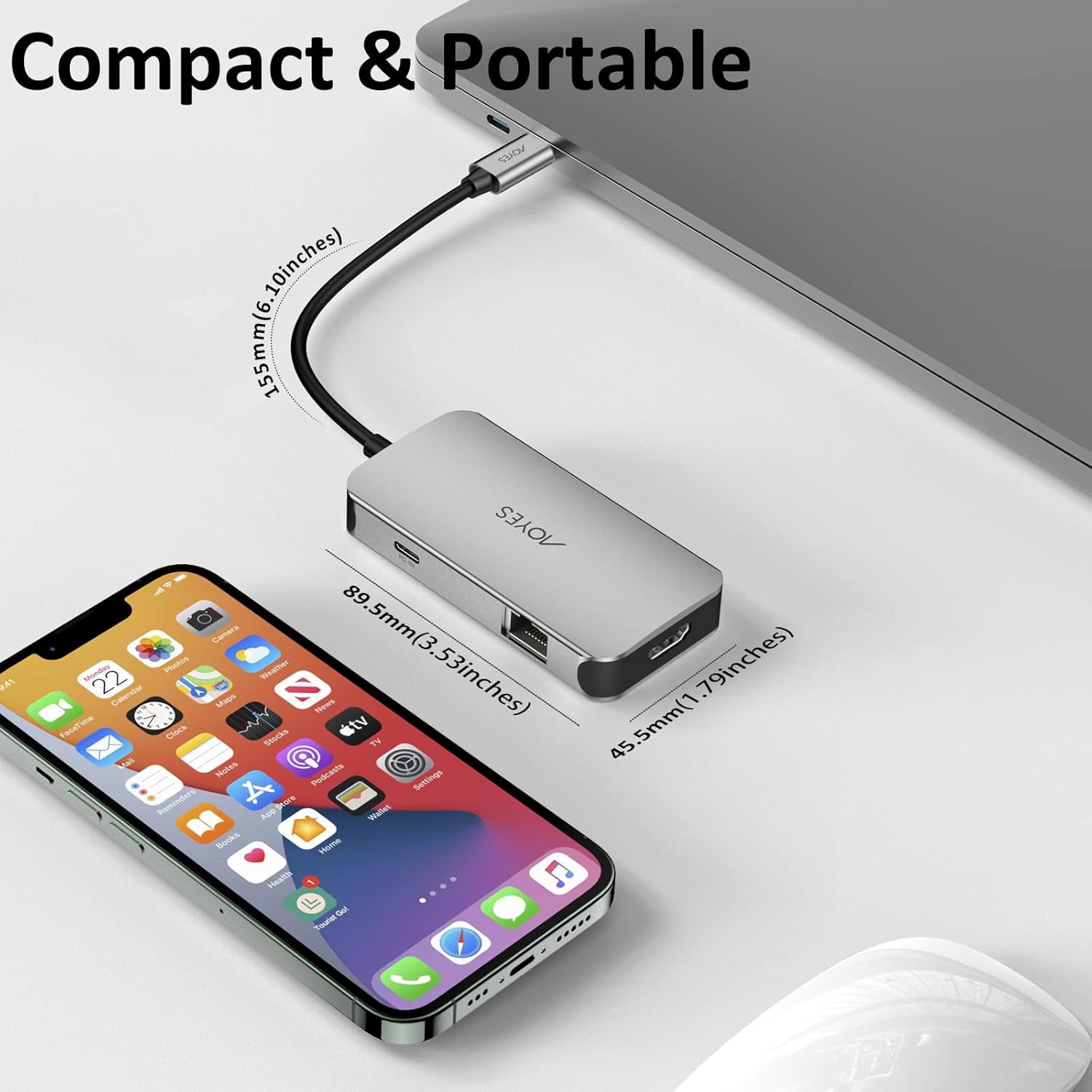 【6-in-1 USB C Hub】This AOYES USB C hub combines advanced 4K HDMI, 1000Mpbs RJ45 ethernet port, 100W fast charging source input port, and 3 USB 3.0 ports(Data transmission speed up to 5Gbps.) in one. It turns a single USB-C port into 6 ports for easily multitasking and improving productivity. No software and drivers are required, plug and play.