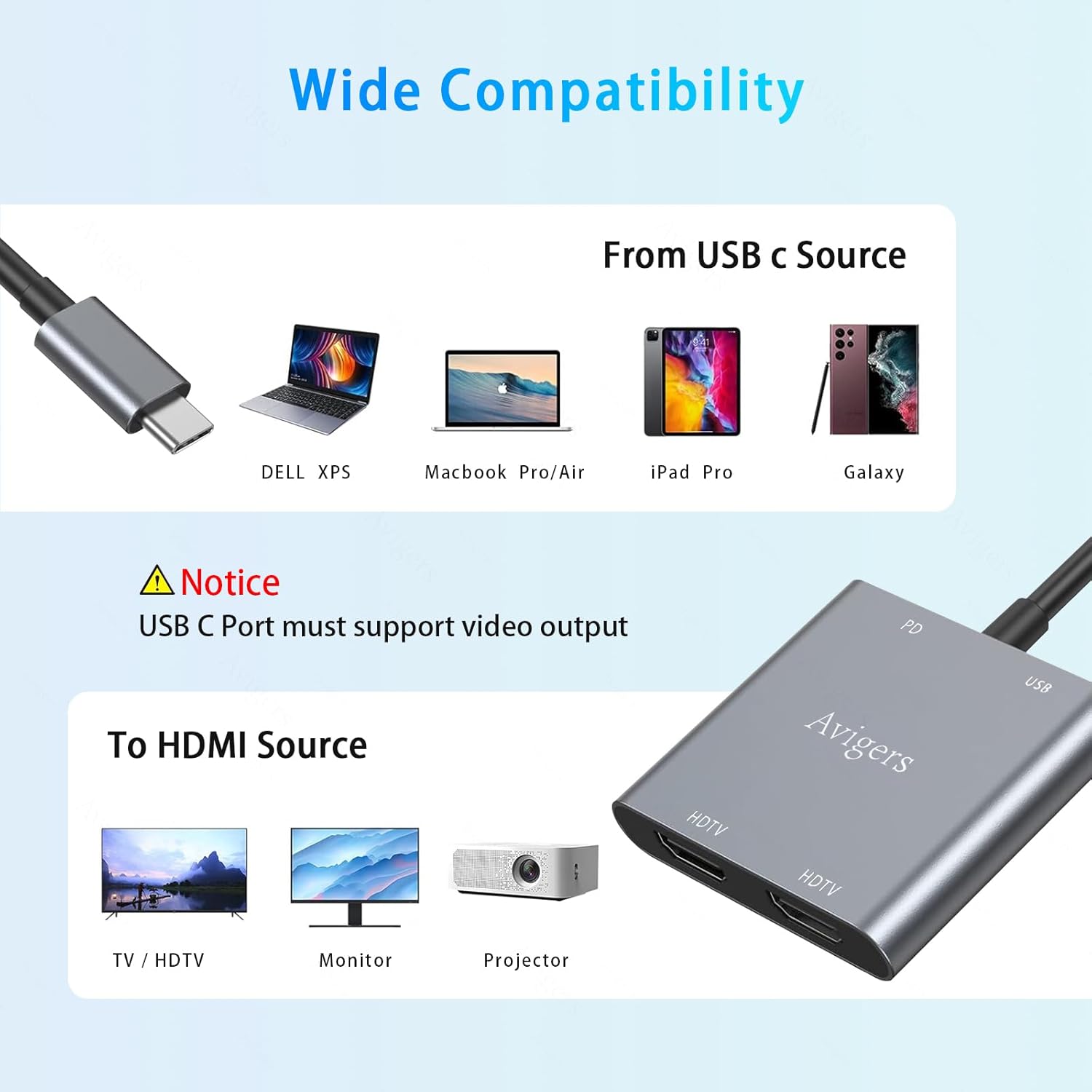 Wide Compatibility: The hdmi splitter 1 in 2 out extended display is plug-and-play compatible with a wide range of USB-C devices, including MacBook Pro, MacBook Air, iMac, iMac Pro, Mac Mini, iPad Pro (2020/2019/2018), iPhone 16/15/Pro Max, Chromebook, Dell, and many other smartphones, laptops, and tablets. (Note: This adapter WON’T support HP Pavilion/Lenovo IdeaPad)