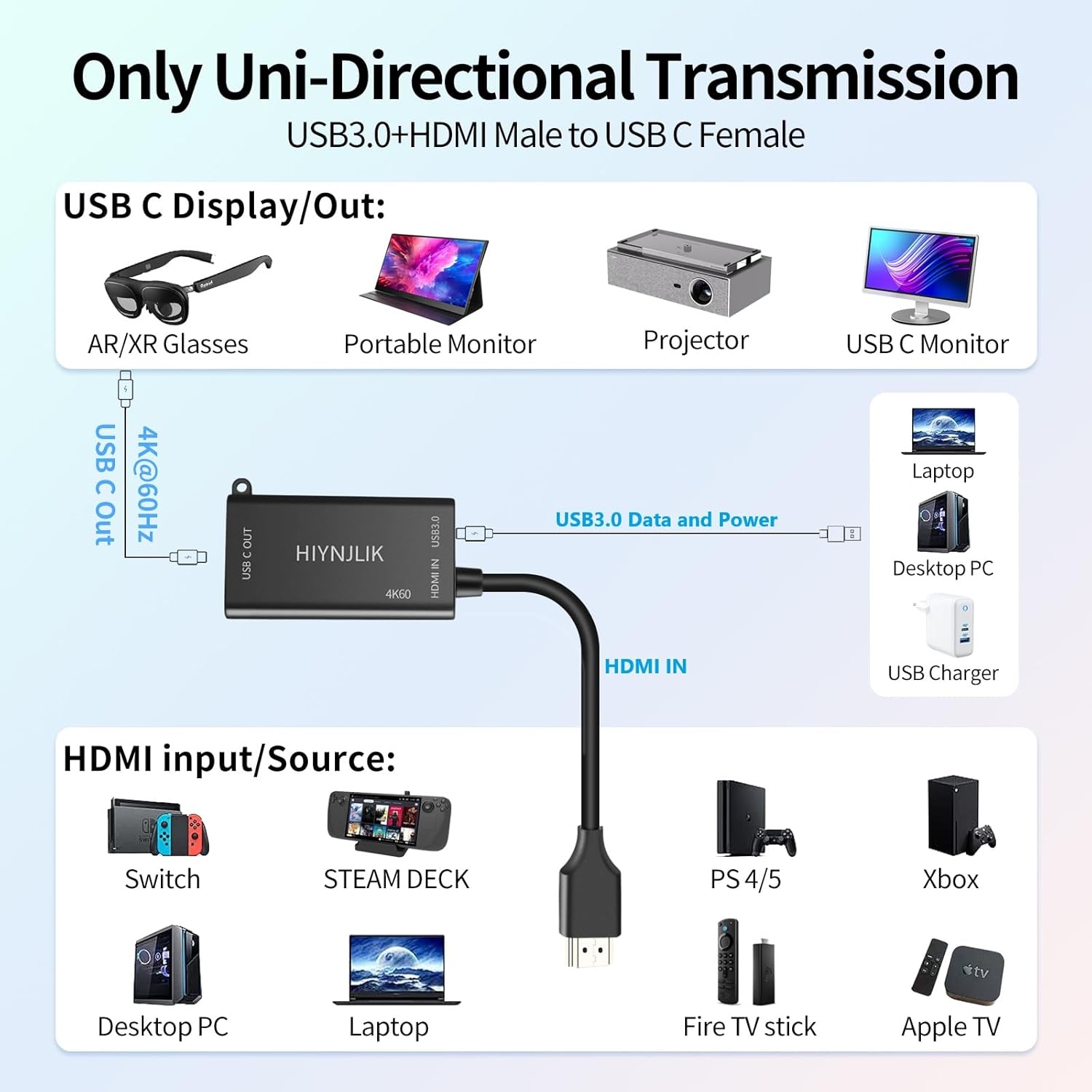 USB3.0 and HDMI to USB C Adapter 4K 60Hz,Uni-Directional USB3.0 to Type C Converter,HDMI Male to USB C Female Adapter for RayNeo,Rokid Max/Air,PC,Laptop,AR Glasses XREAL Air,PS4/5,Xbox