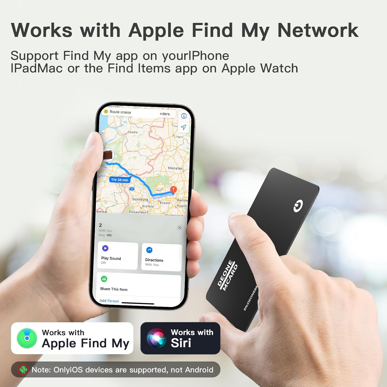 [Find Nearby] When your item is within Bluetooth range (160ft/50m), tap ‘Play Sound’ in the Find My app or let Siri ring the wallet tracker Item Locator to locate nearby items. ( Please note: Android devices are not supported.)