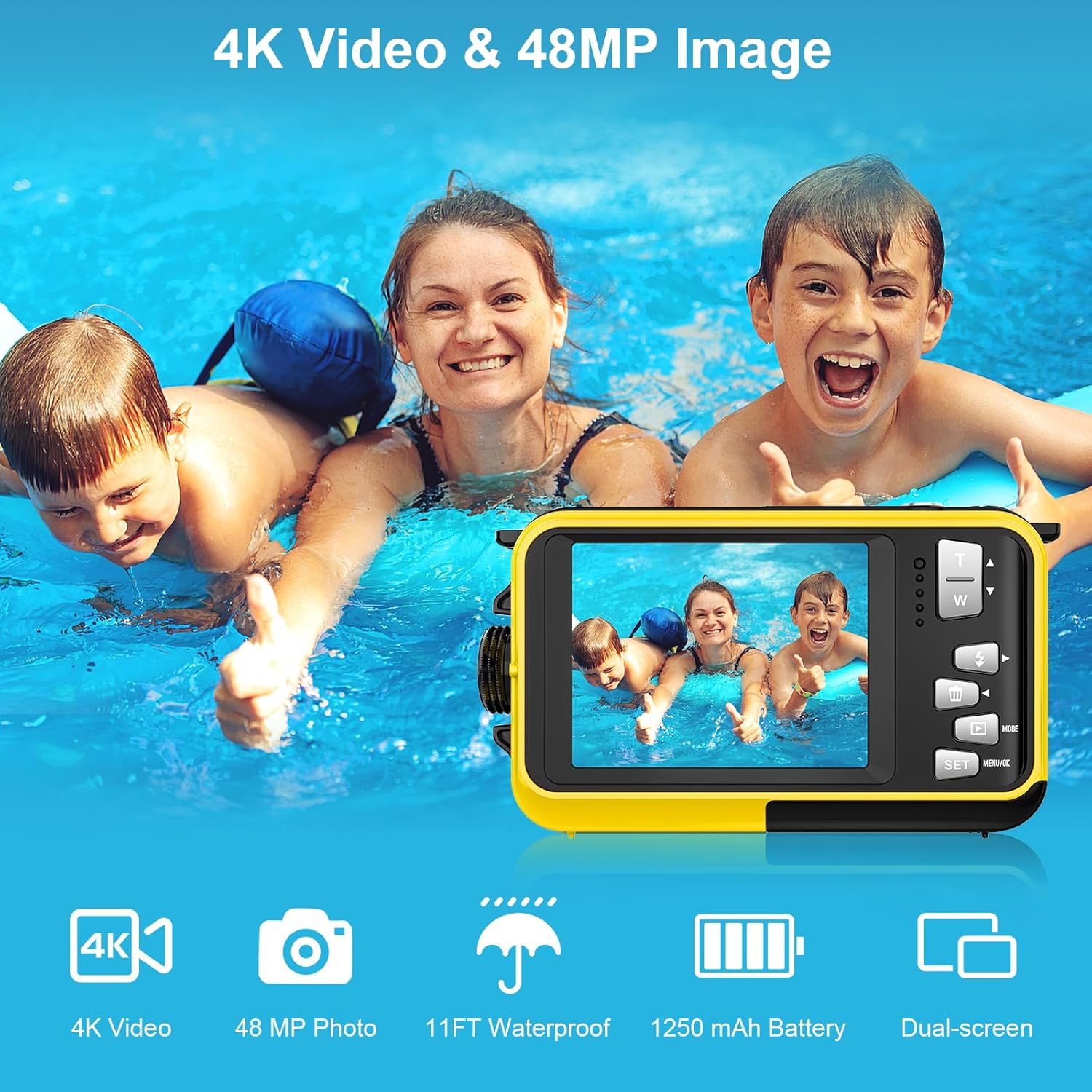 【11FT Underwater Camera】 This camera can be submerged 11 feet underwater without a waterproof case. Before staying underwater, please be careful to ensure that the battery door is locked to waterproof into the camera, you can take it to diving, swimming, snorkeling and other activities. To take it and you will not miss any scenery you want to record.